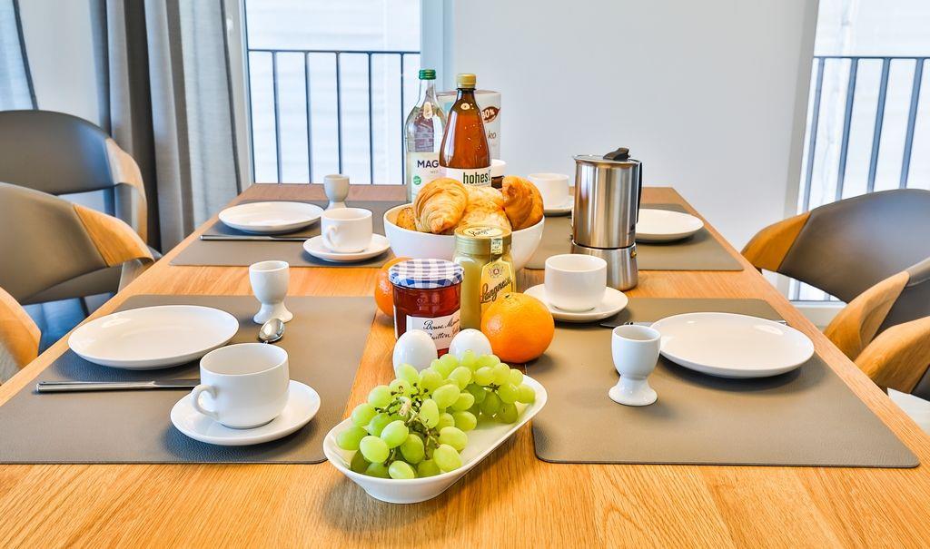 Der helle, großzügige Wohn-/ Essbereich ist mit einer Einbauküche und gemütlichen Sitzmöglichkeiten ausgestattet. Hier befindet sich ebenfalls der Zugang zur Loggia, welche mit einem Elektrogrill für sonnige Stunden bestückt ist.
