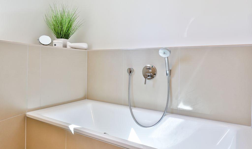 Das Tageslichtbadezimmer verfügt über eine ebenerdige Dusche sowie eine Badewanne für eine erholsame Auszeit.