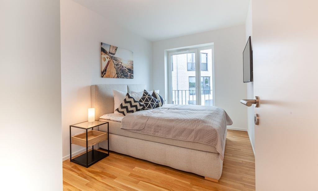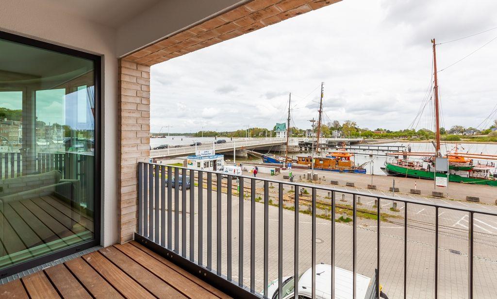 Moderne Ferienwohnung in Kappeln mit Blick auf die Schlei und Schleibrücke.