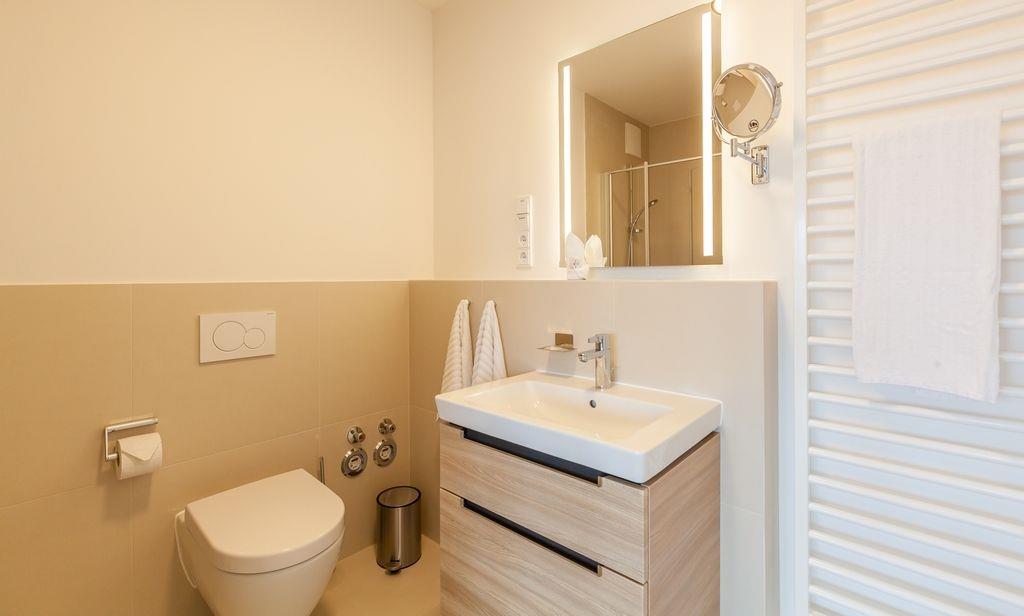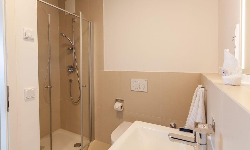 Das moderne Badezimmer verfügt über eine ebenerdige Dusche.