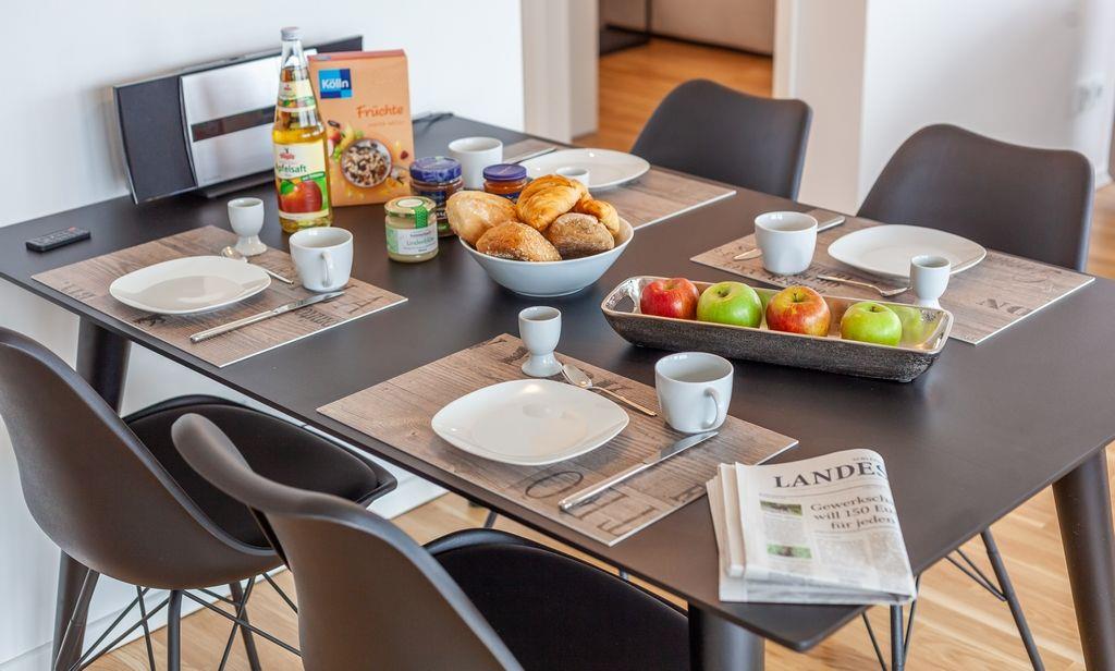 Der geräumige Wohn-/ Essbereich bietet eine voll ausgestattete Einbauküche, einen Esstisch und eine Sofaecke für eine entspannende Auszeit.