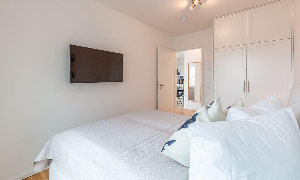 Das Schlafzimmer ist mit einem Doppelbett der Größe 2x 80x200 cm, einem Kleiderschrank und einem Fernsehgerät ausgestattet.