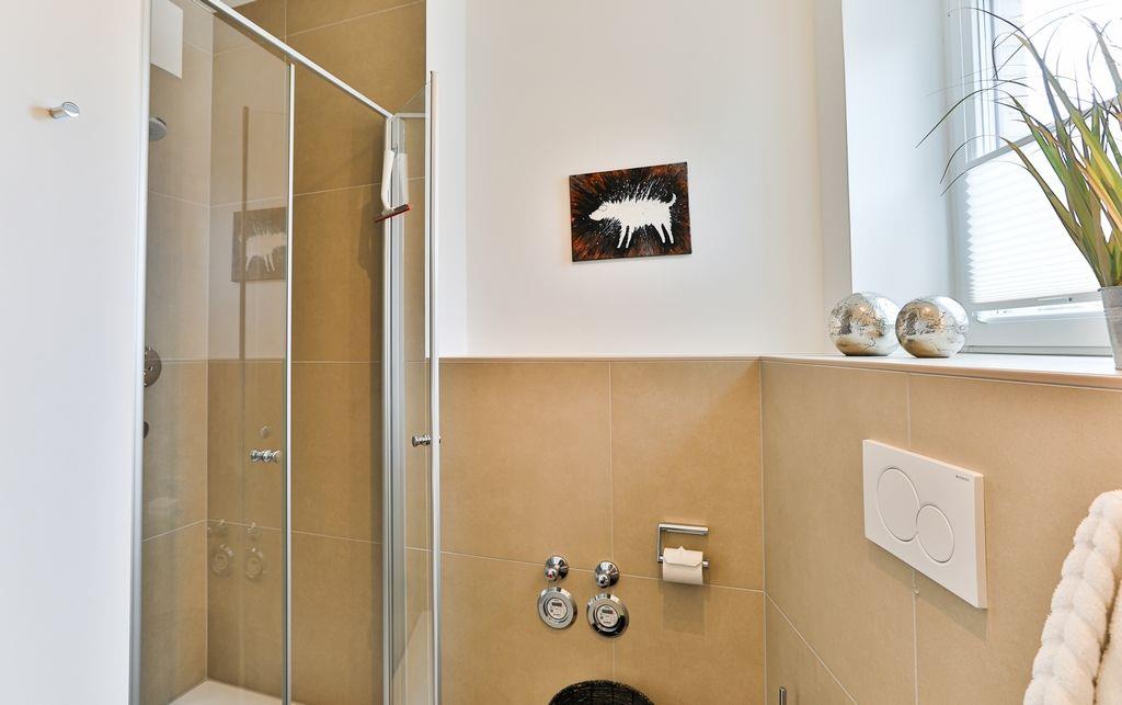 Gegenüber befindet sich das Tageslichtbadezimmer mit ebenerdiger Dusche und vielen weiteren modernen Ausstattungen.