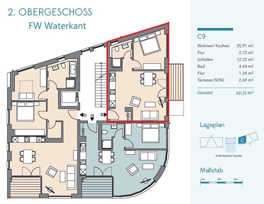 Die 49qm Wohnung liegt im 2. Obergeschoss des Hauses und verfügt über zwei Zimmer: