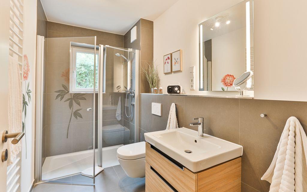 Das angrenzende Tageslichtbadezimmer verfügt über eine ebenerdige Dusche und weitere moderne Ausstattungen für den täglichen Bedarf.