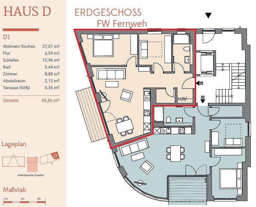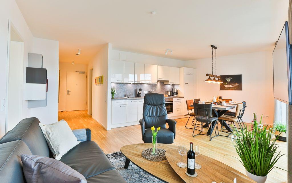 Durch den Eingangsbereich erreicht man den charmant eingerichteten Wohn-/ Essbereich mit großer Fensterfront. Der Wohn-/ Essbereich ist mit einer modernen Einbauküche, einem Esstisch und einer gemütlichen Sofagarnitur ausgestattet. Von hier gelangt man ebenfalls zur Terrasse der Wohnung, welche mit Gartenmöbeln und einem Elektrogrill bestückt ist.