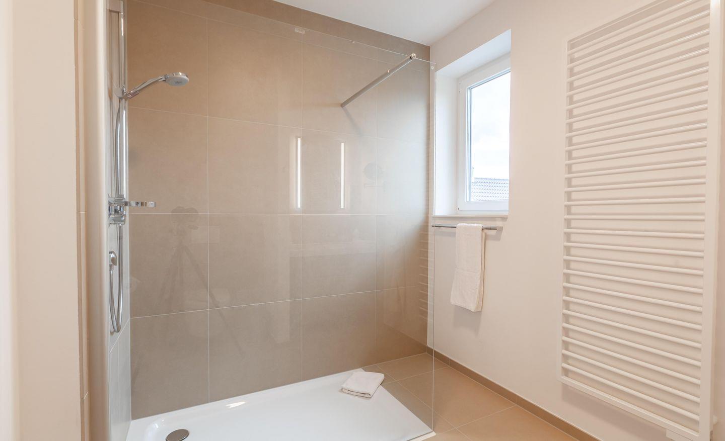 Das Tageslichtbadezimmer bietet eine ebenerdige Dusche. Eine Waschmaschine und ein Trockner befinden sich im Keller (Münzbetrieb).