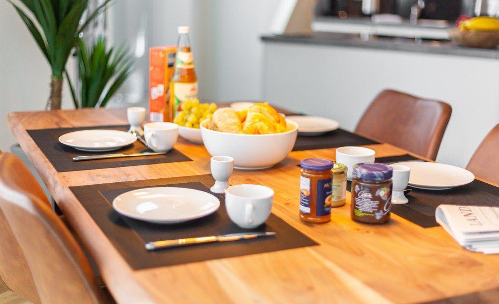 Der helle, weitläufige Wohn-/ Essbereich ist mit einer modernen Einbauküche, einem Esstisch, einem Kaminofen und einer gemütlichen Sofaecke ausgestattet. Zudem gelangt man über den Wohn-/ Essbereich auf die großzügige Dachterrasse, welche mit Strandkorb, zwei Sonnenliegen, Gartenmöbeln und einem Elektrogrill bestückt ist.