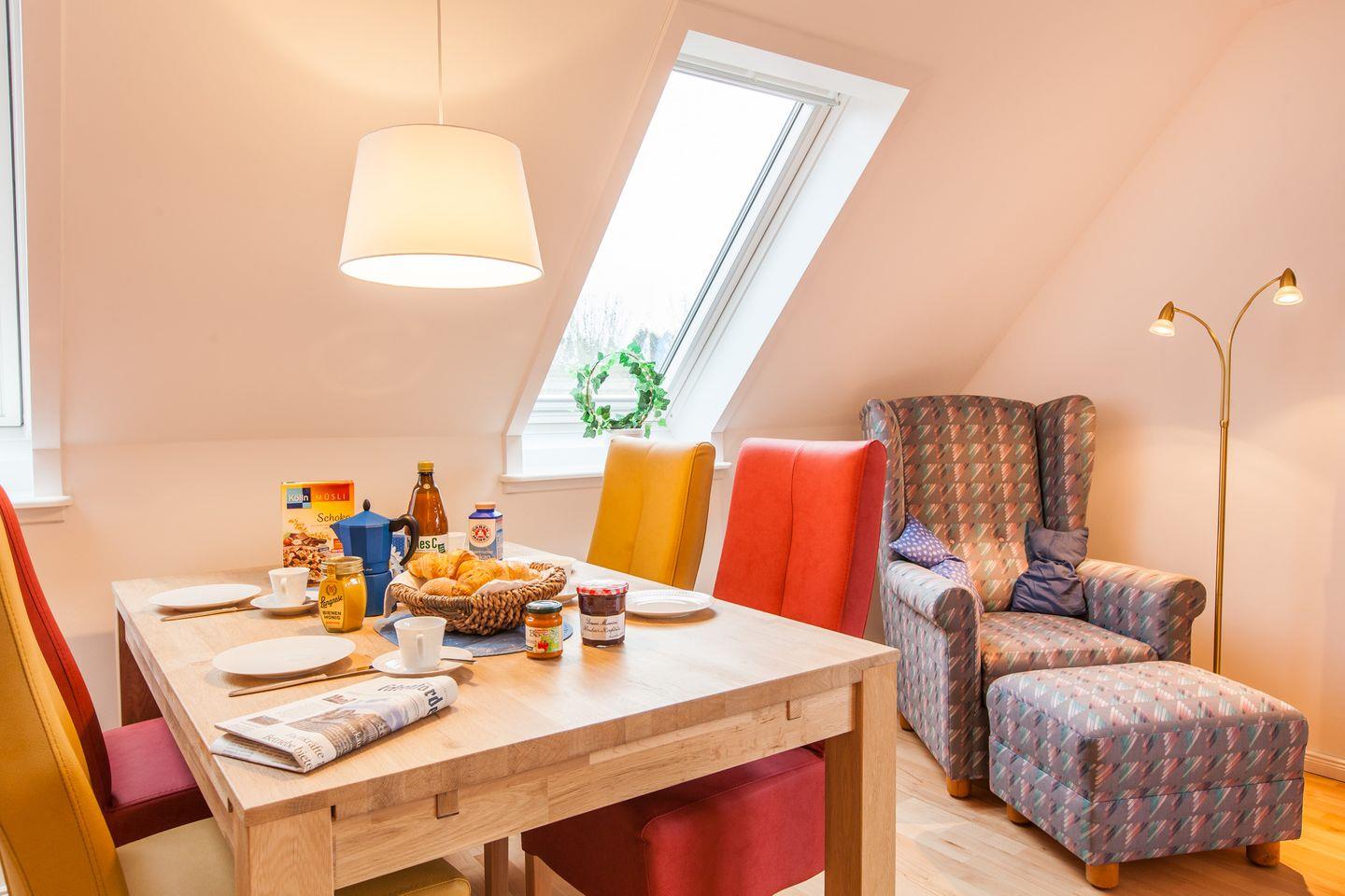 Das großzügige Wohn-/ Esszimmer ist mit liebevollen Details eingerichtet; von hier gelangen Sie auf den West-Balkon mit Balkonmöbeln.