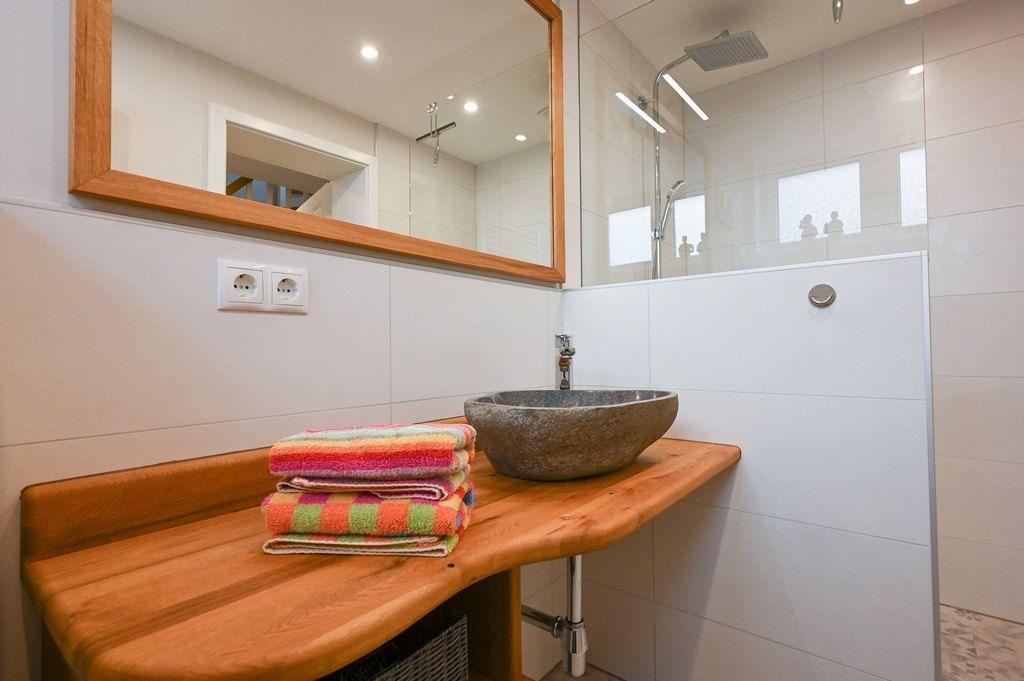 Über den Flur im Erdgeschoss gelangen Sie in das Badezimmer, sowie in die offene Küche. Hier empfängt Sie ein besonderes Highlight: Eine Küche, die auf einem alten Fischerboot erbaut wurde. Das Fischerboot wurde hierbei aufwändig restauriert und in der Mitte geteilt. Angrenzend an die Küche liegt der Hauswirtschaftraum (Waschmaschine mit Münzbetrieb), von dem Sie in den Außenbereich kommen, sowie der gemütliche Wohn- und Essbereich – auch hier wurde mit Liebe zum Detail gearbeitet.