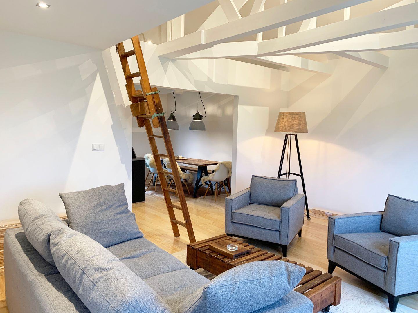 Das geräumige Wohnzimmer lädt Sie mit einer gemütlichen Couch- und Sesselgarnitur zum Verweilen ein und die weiß getünchten, offengelegten Holzbalken der Decke unterstreichen den besonderen Charme des Hauses. Von hier aus gelangen Sie außerdem über eine stabile Leiter in den gemütlich angelegten Loungebereich mit zwei Sesseln… machen Sie es sich hier bei einem spannenden Buch bequem und genießen Sie die Ruhe.