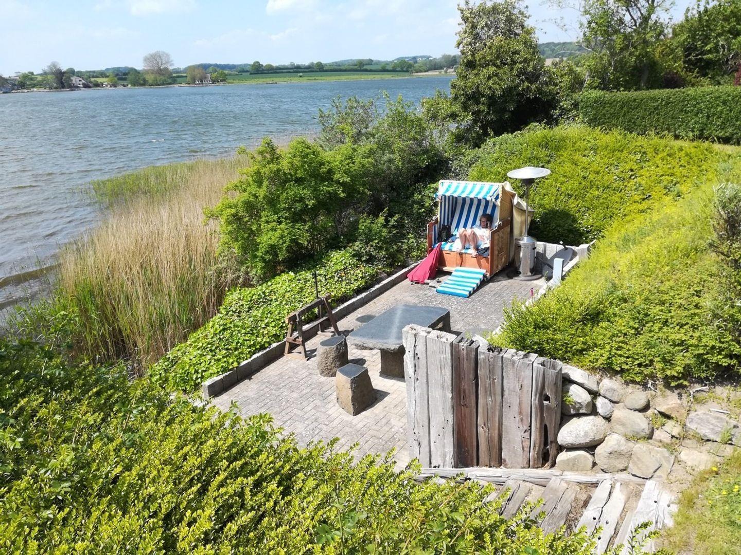 An Ihrem privaten Zugang zur Schlei erwartet Sie eine weitere Terrasse mit Steinmöbeln und einem Strandkorb.
