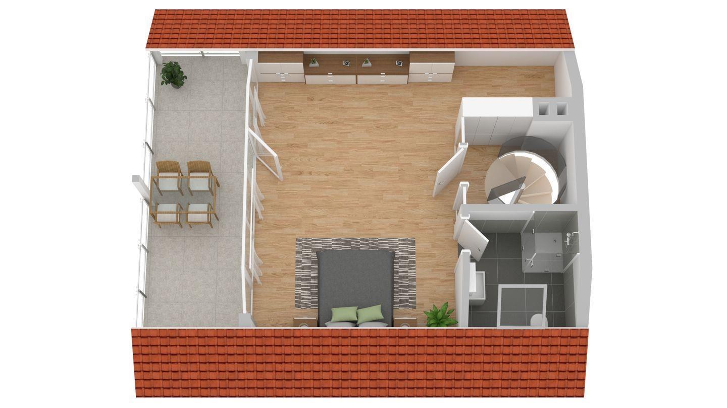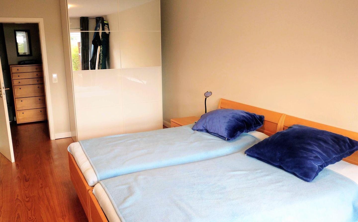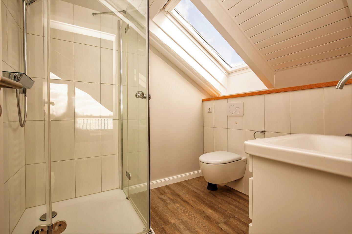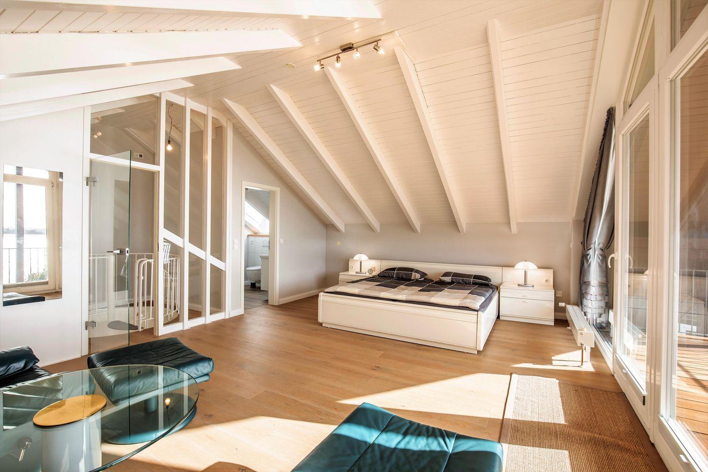 Dieselbe Treppe führt Sie auch ins Dachgeschoss, wo sich ein großes Schlafzimmer mit bodentiefen Fenstern mit eigenem Badezimmer und Balkon befindet, von dem aus Sie einen wunderschönen Blick über das Wasser bis nach Arnis, der kleinsten Stadt Deutschlands, haben.