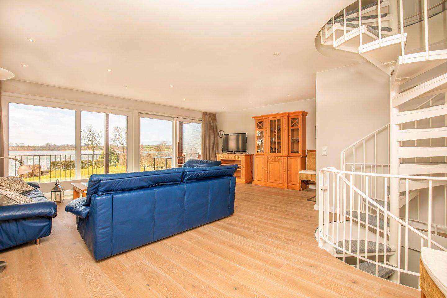 Im Erdgeschoss erwartet Sie ein verglaster Eingangsbereich mit einer offenen Garderobe. Von hier aus gelangen Sie in das geräumige Wohnzimmer mit angrenzender Terrasse von der Sie einen herrlichen Blick über die Schlei haben. Machen Sie es sich hier gemütlich und genießen Sie Ihre Urlaubszeit.