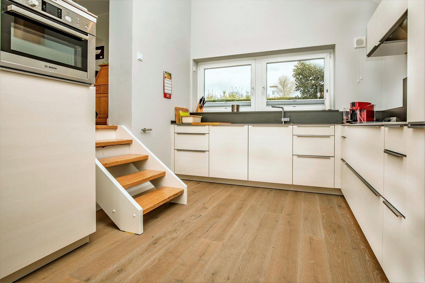 Die ebenfalls zum Wohnbereich angrenzende offene Küche mit Essbereich lädt zum gemeinsamen Kochen ein. Beide Räume bieten direkten Zugang zum Garten.