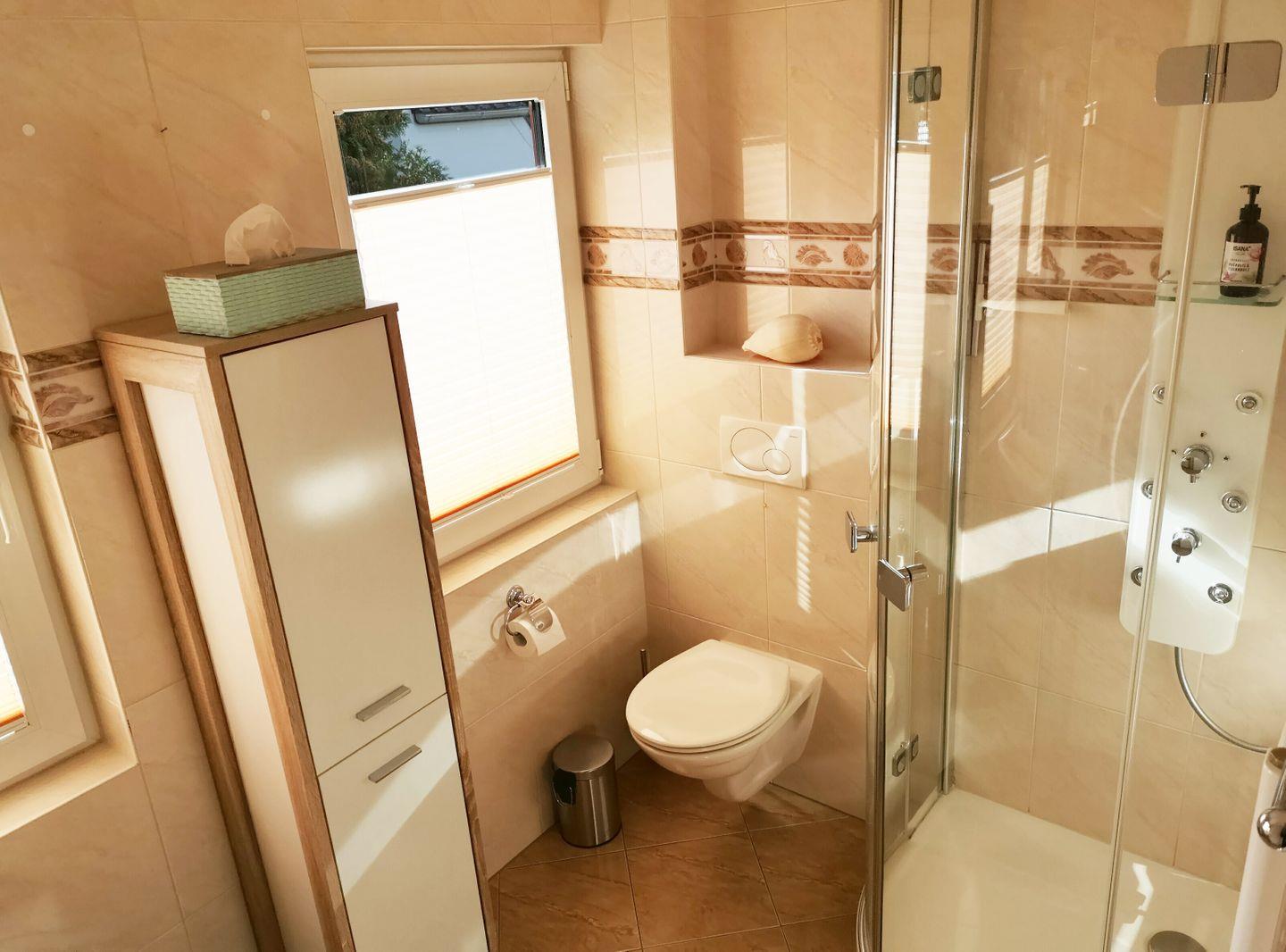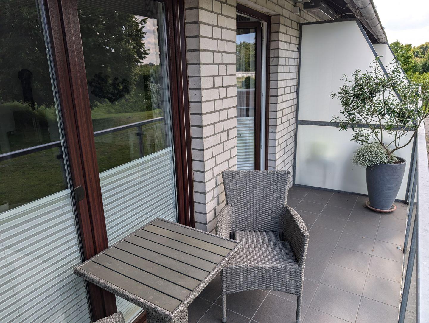 Die Wohnung ist Teil eines ruhigen Hauskomplexes mit 4 Parteien. Als "Reihenmittelhaus" verfügt die Wohnung über einen eigenen Hauseingang. Das EG betritt man über den Eingangsbereich mit Zugang zum Gäste-WC. Von hier aus führt eine Tür in den großzügigen Wohn-/Essbereich mit offener Küche, Kamin und Balkon mit Blick auf die Schlei. Ins 1. OG gelangt man über eine Wendeltreppe. Hier befinden sich das großzügige Schlafzimmer und das Duschbad.