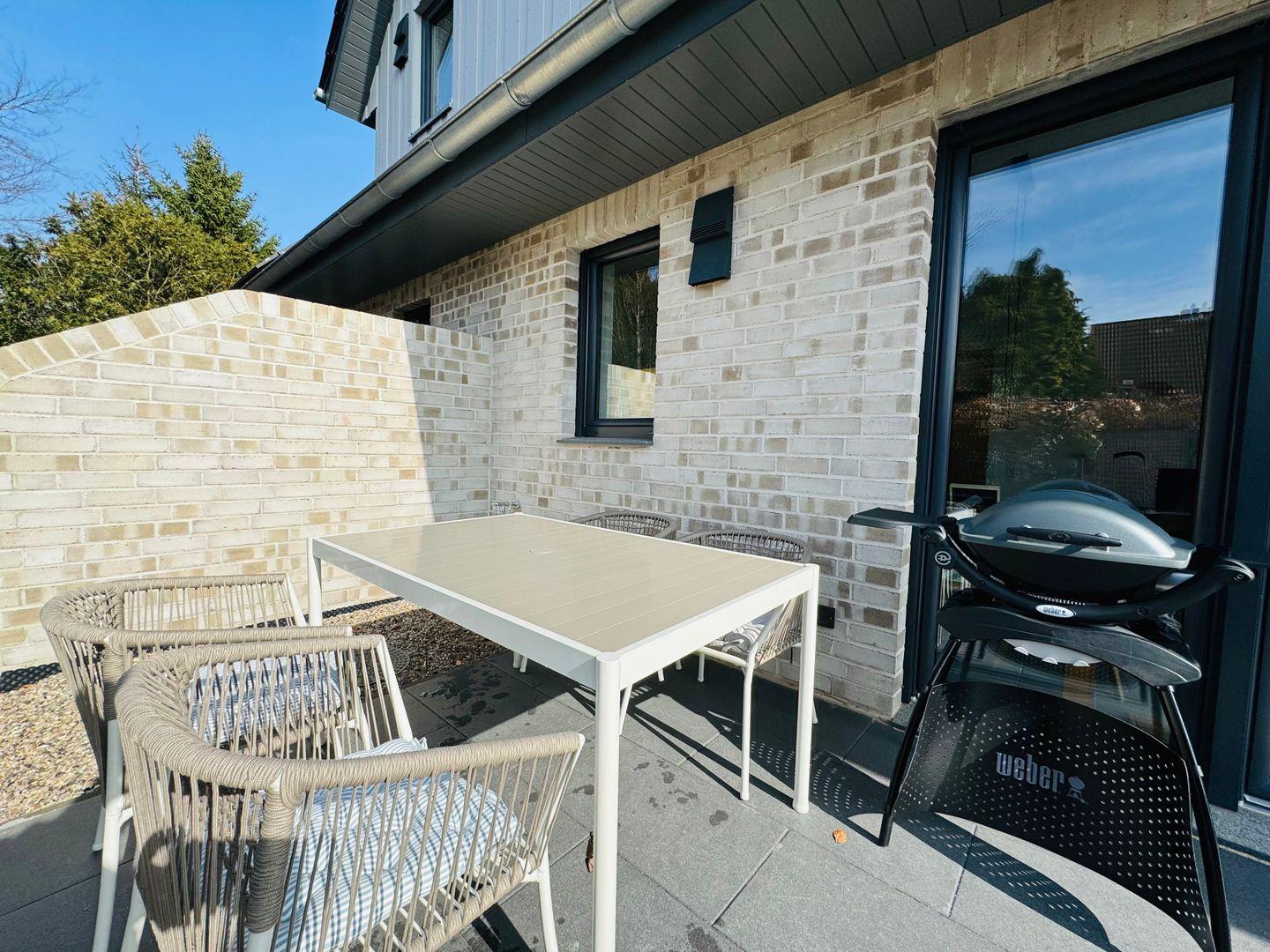 Im Außenbereich erwarten Sie auf der 18qm große Terrasse zwei Sonnenliegen, Gartenmöbel und ein Elektrogrill. Zudem steht Ihnen am Haus ein eigener Abstellraum für Fahrräder mit Steckdose zur Verfügung.