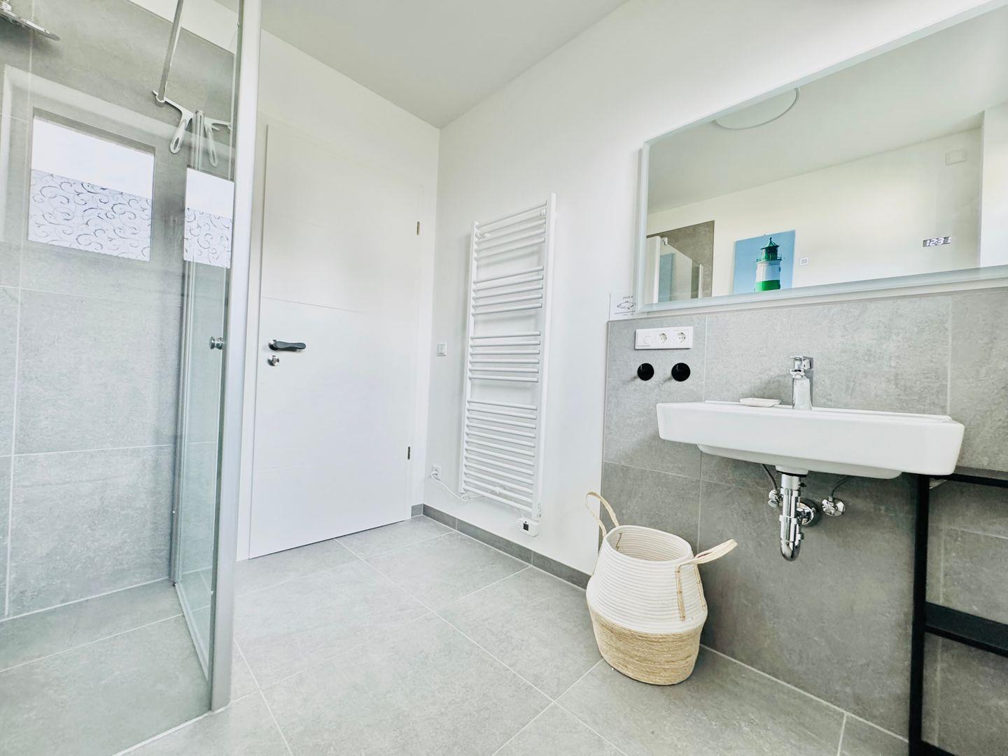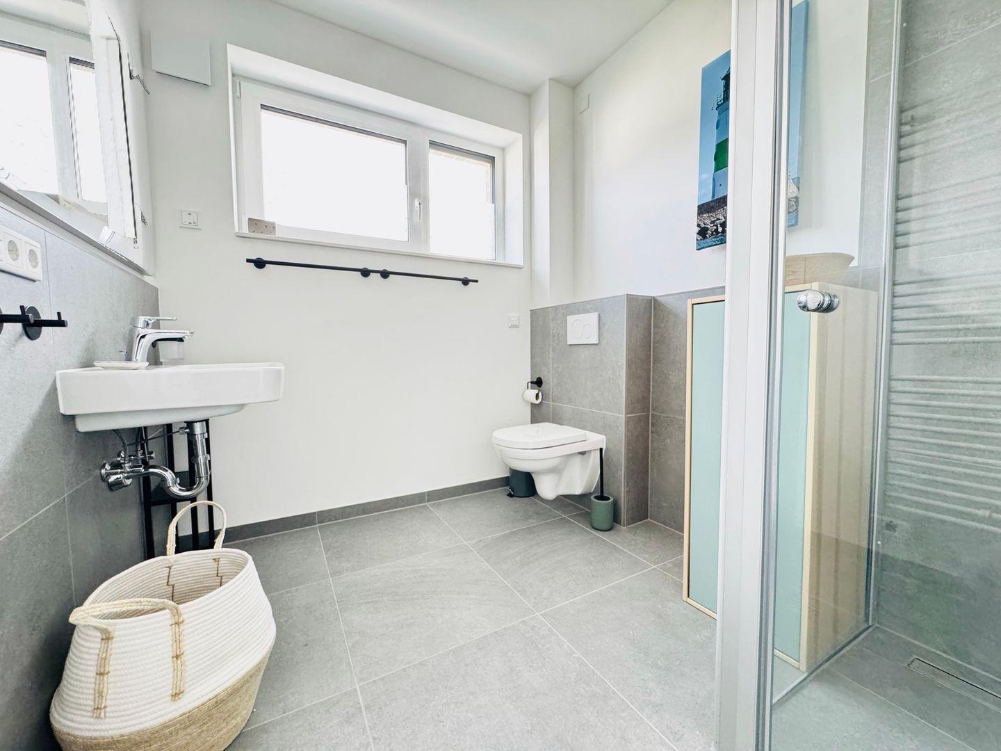 Das Tageslichtbad ist mit WC, bodengleicher Dusche, Waschtisch und Handtuchheizkörper ausgestattet. Großformatige Fliesen ergänzen die moderne Ausstattung. Die gesamte Wohnung wird über eine Fußbodenheizung angenehm beheizt und verfügt über eine eigene Wohnraumlüftung mit Wärmerückgewinnung. Das Bad befindet sich direkt neben dem großen Schlafzimmer, das kleine Schlafzimmer grenzt an das große Schlafzimmer. Gegenüber im Flur befindet sich ein Abstellraum.
