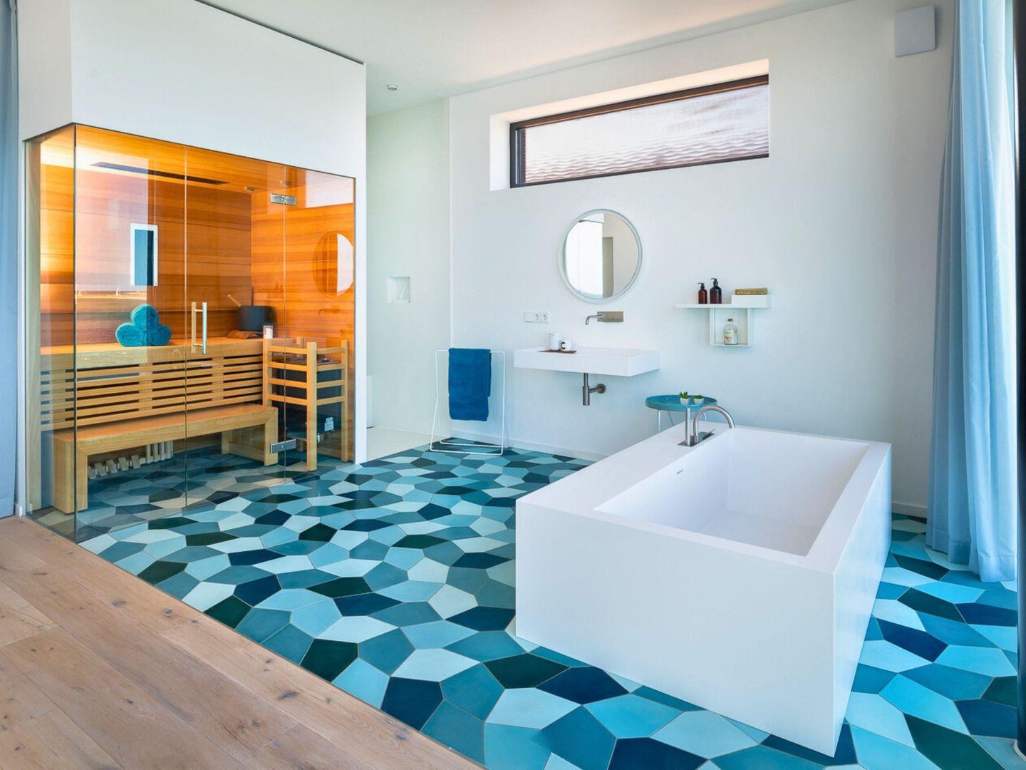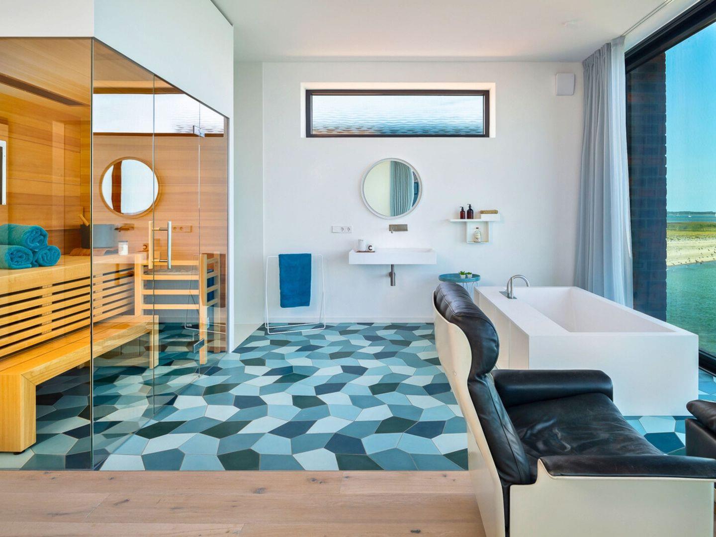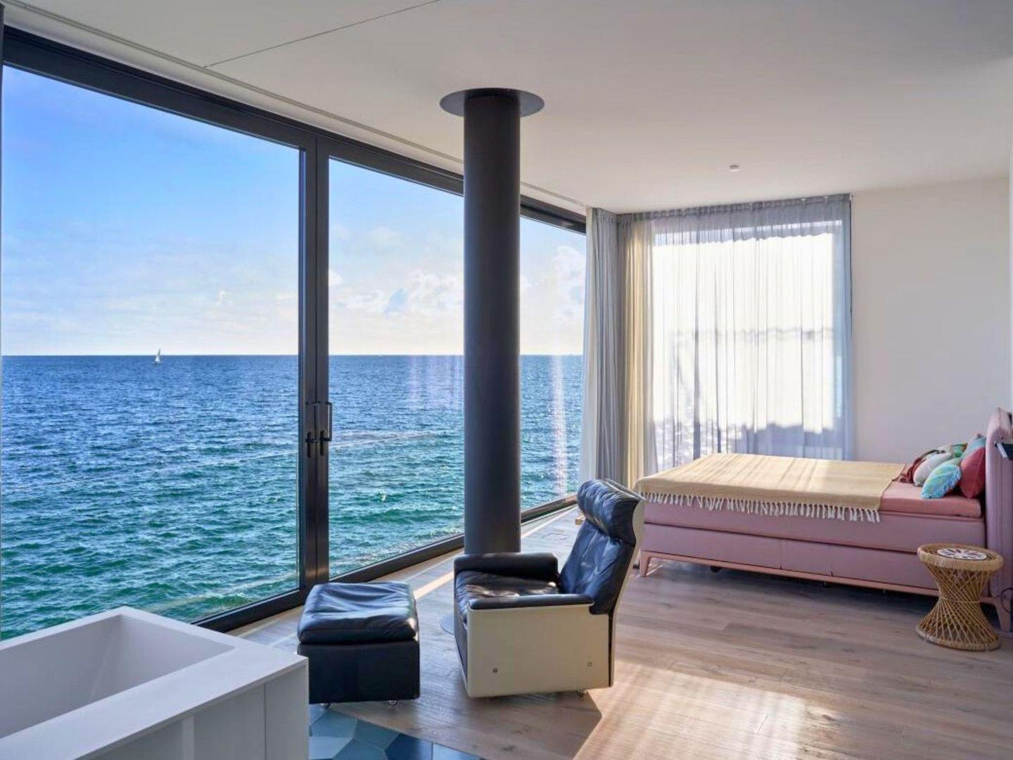 Im Obergeschoss erwarten Sie vier private Rückzugsorte, darunter eine Mastersuite mit Duschtoilette und Bio-Sauna. Die Dachterrasse bietet einen grandiosen 360-Grad-Blick über die Ostsee und die umliegende Natur.