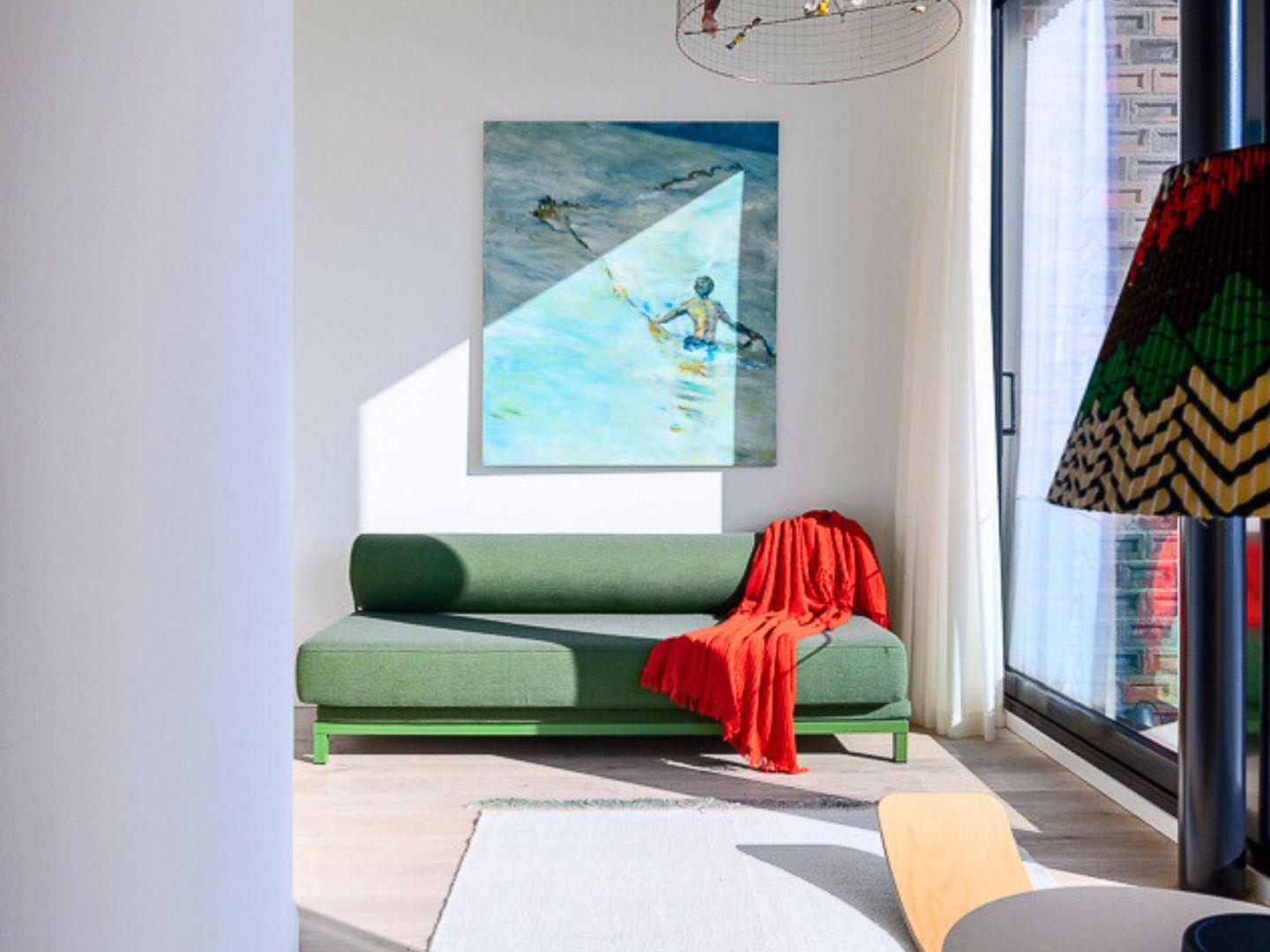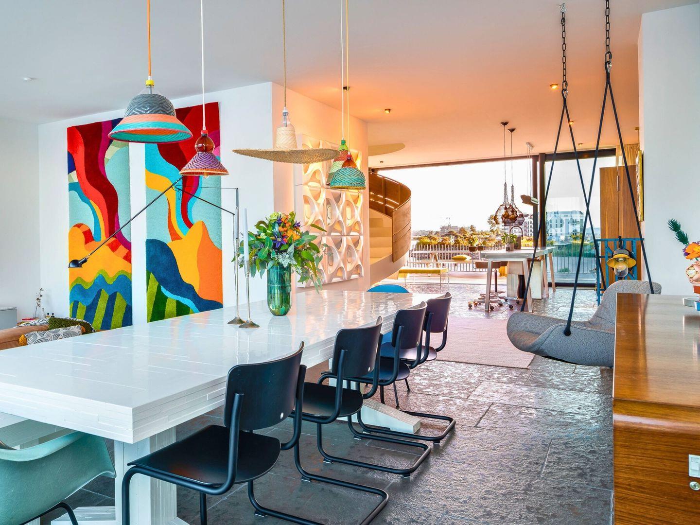 Außergewöhnliche Ziegel aus Egernsund verleihen dem Gebäude eine lebendige rote Farbe. Diese zeigt im Zusammenspiel von Sonne und Wolken stets neue Nuancen. Hohe Decken und riesige Fensterflächen sorgen für eine helle, einladende Atmosphäre. Edle Materialien wie indischer Sandstein und handgemachte Zementfliesen geben jedem Raum einen individuellen Charakter.