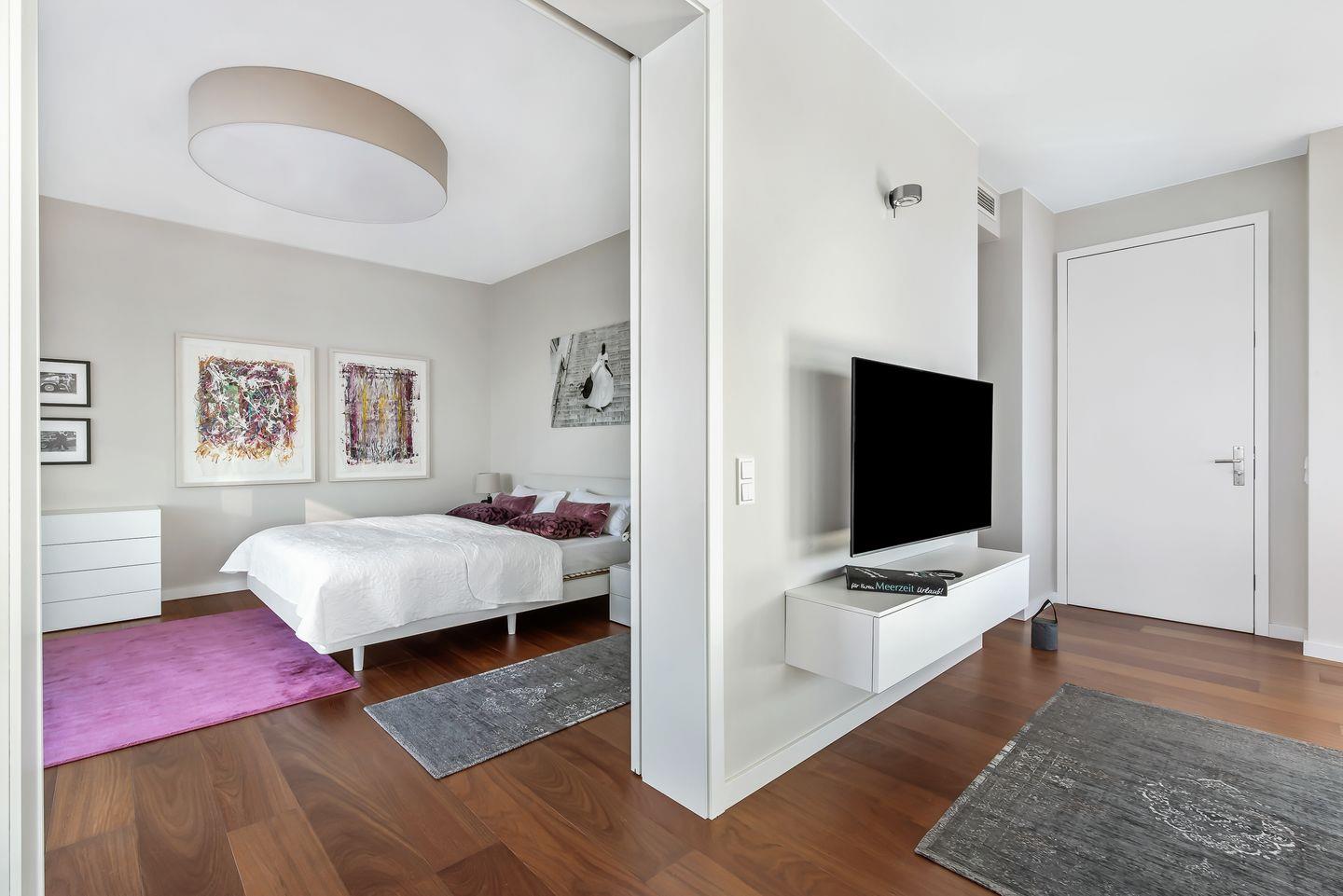 Das zweite Schlafzimmer ist mit einem hochwertigen Schlafsofa, einem Schreibtisch und einer Kommode ausgestattet und bietet Platz für eine dritte Person. Hier fühlen sich Kinder willkommen und können mittels bodentiefer Fenster den Blick über die Ostsee schweifen lassen. Auch hier gibt es einen kleinen Balkon, der mit Möbeln ausgestattet ist.