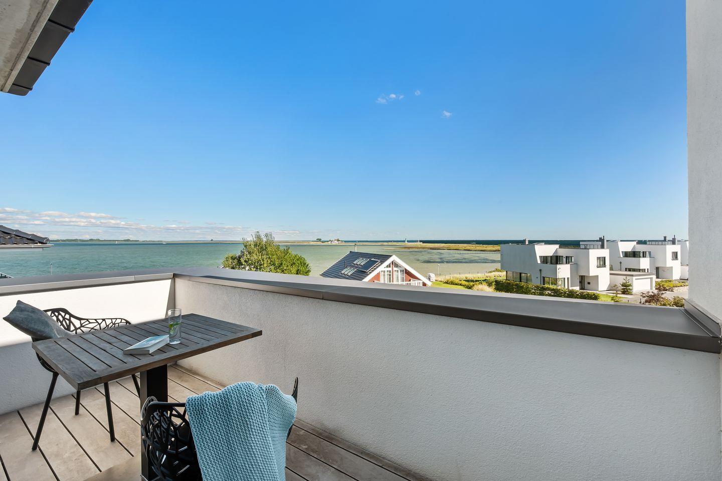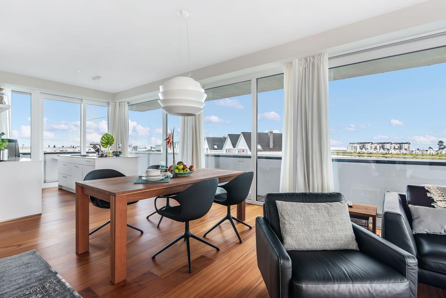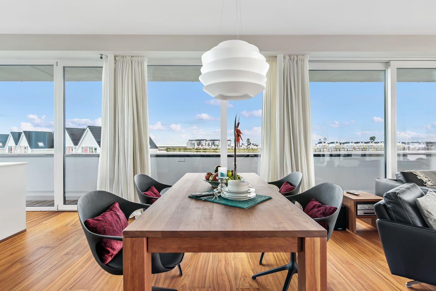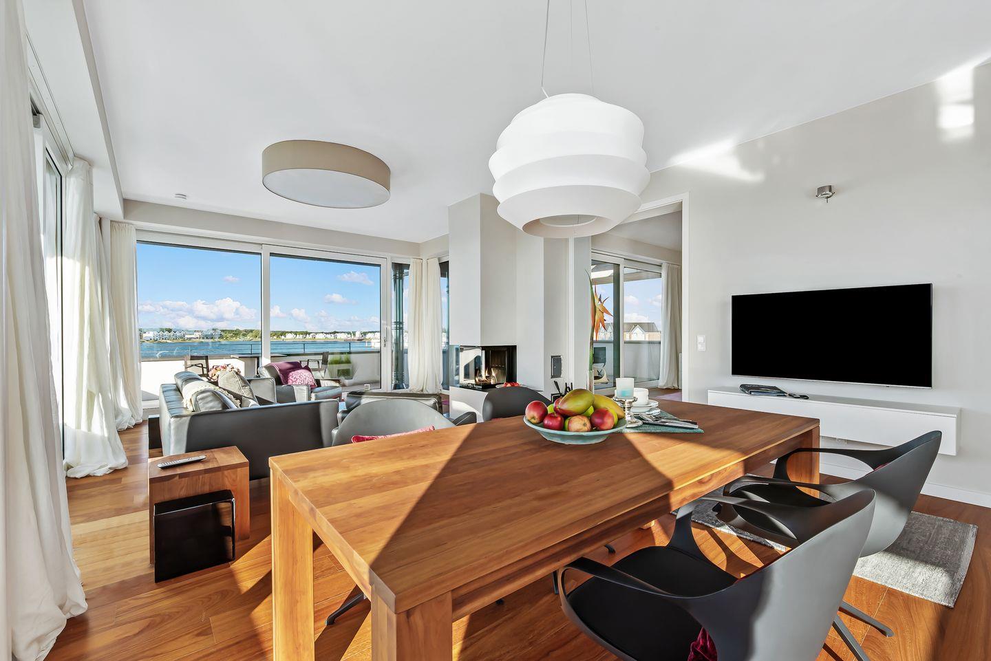 Schon beim Eintreten wandert der Blick direkt durch die großen Panoramafenster auf das Wasser und in diesem Penthouse ist aus jedem bodentiefen Fenster der Meerblick garantiert. Der große Wohn-Essbereich mit offener Küche bildet den Dreh- und Angelpunkt des Urlaubs. Hier ist eine hochwertige Küche mit perfekt ausgestatteter Kochinsel verbaut. Auch beim Kochen muss somit nicht auf den Meerblick verzichtet werden. Der sich anschließende gemütliche Esstisch für 4 Personen befindet sich mittig im Raum und bietet den perfekten Platz für schöne Spieleabende oder ein mehrgängiges Menü.