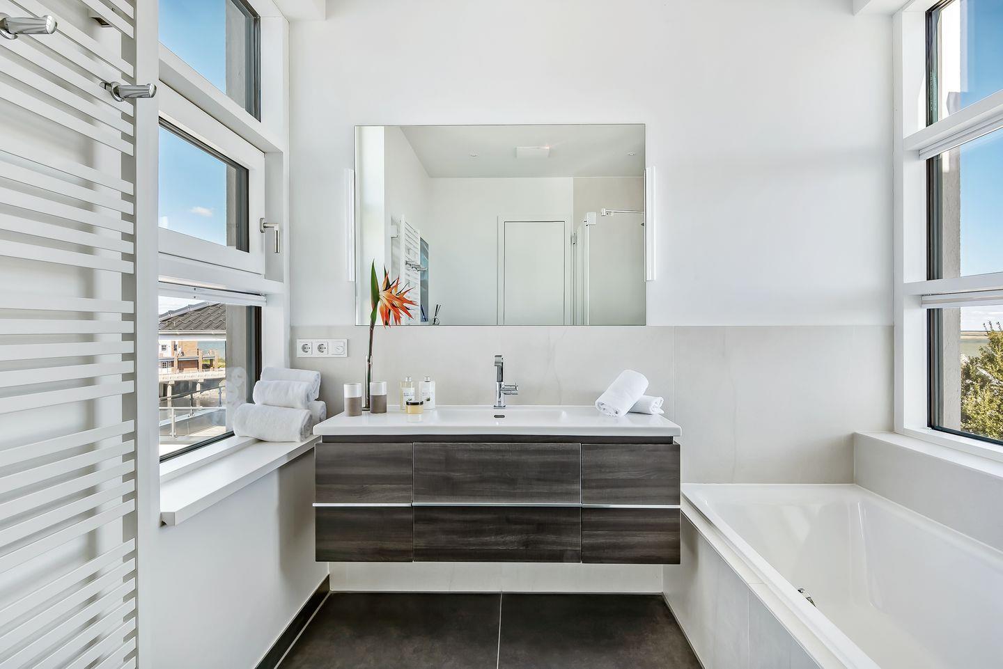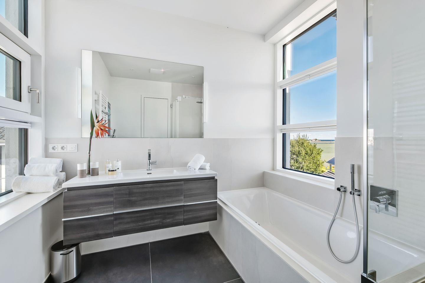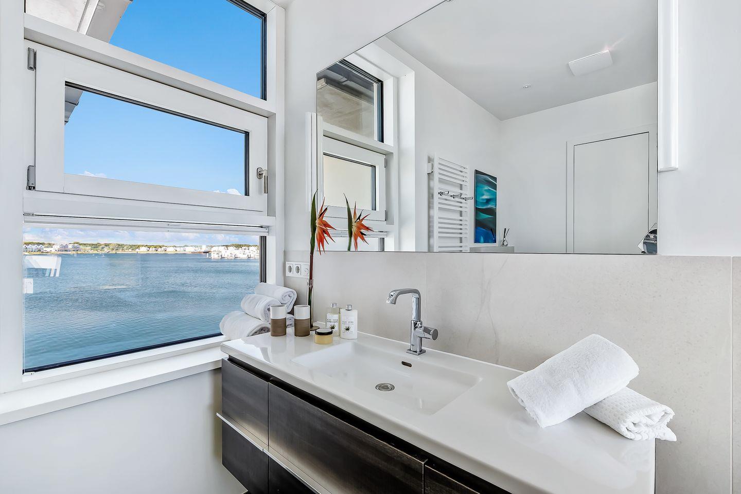 Das angrenzende Badezimmer verfügt ebenfalls über Meerblick, der schon morgens beim Zähneputzen genossen werden kann. Eine Badewanne, eine große Regendusche, ein WC und ein Waschtisch erwarten unsere Gäste.