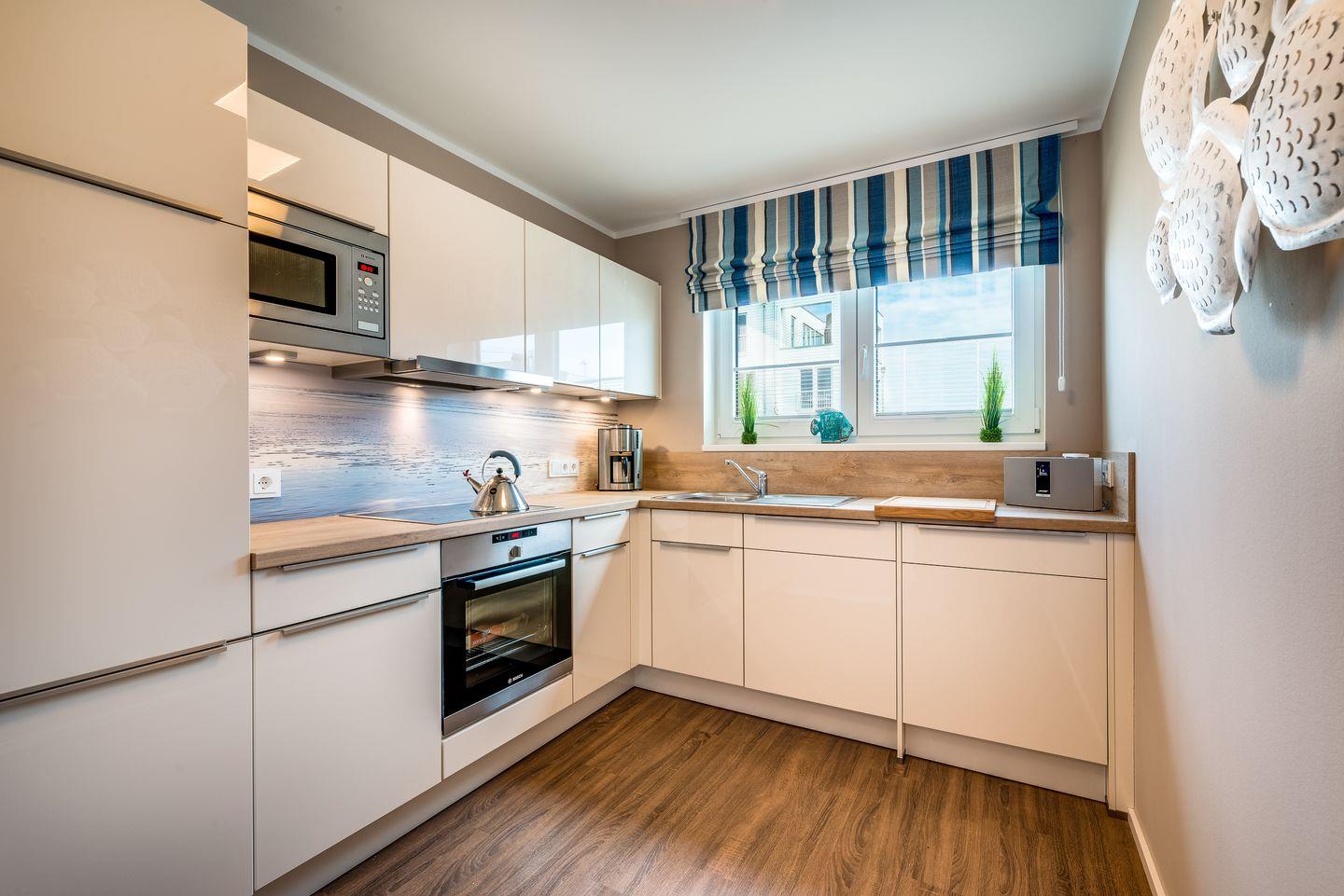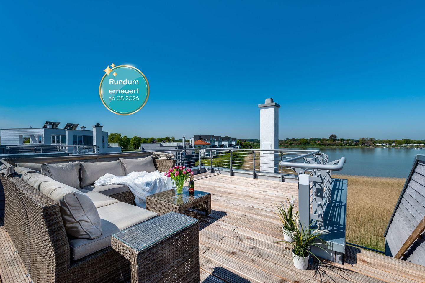 Für die 5. Person steht ein Schlafsofa im Wohnbereich zur Verfügung. Von hier aus gelangen Sie auf die große Dachterrasse, die einen fantastischen Ausblick auf das gesamte Ostseeresort, die Schlei und Ostsee ermöglicht. Ausgestattet mit Loungemöbeln, Sonnenschirm und einem Elektrogrill kann hier der Urlaubstag perfekt ausklingen oder auch beginnen.