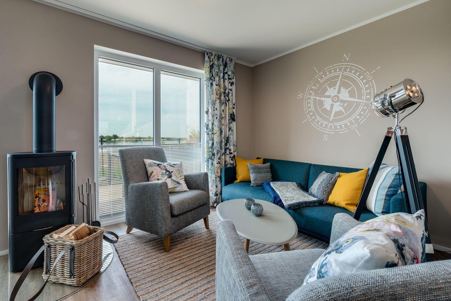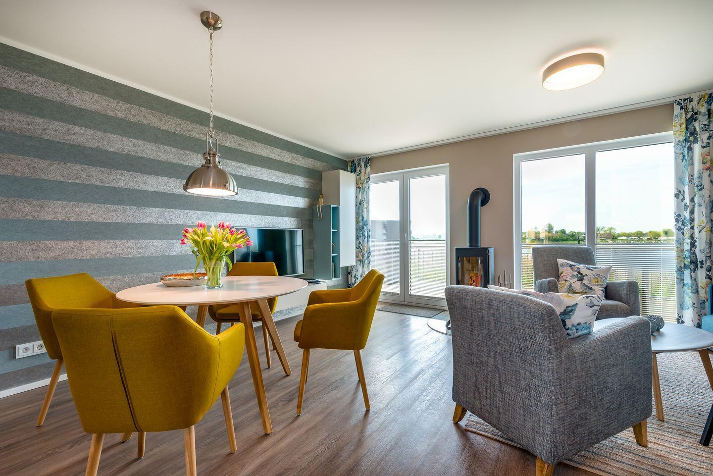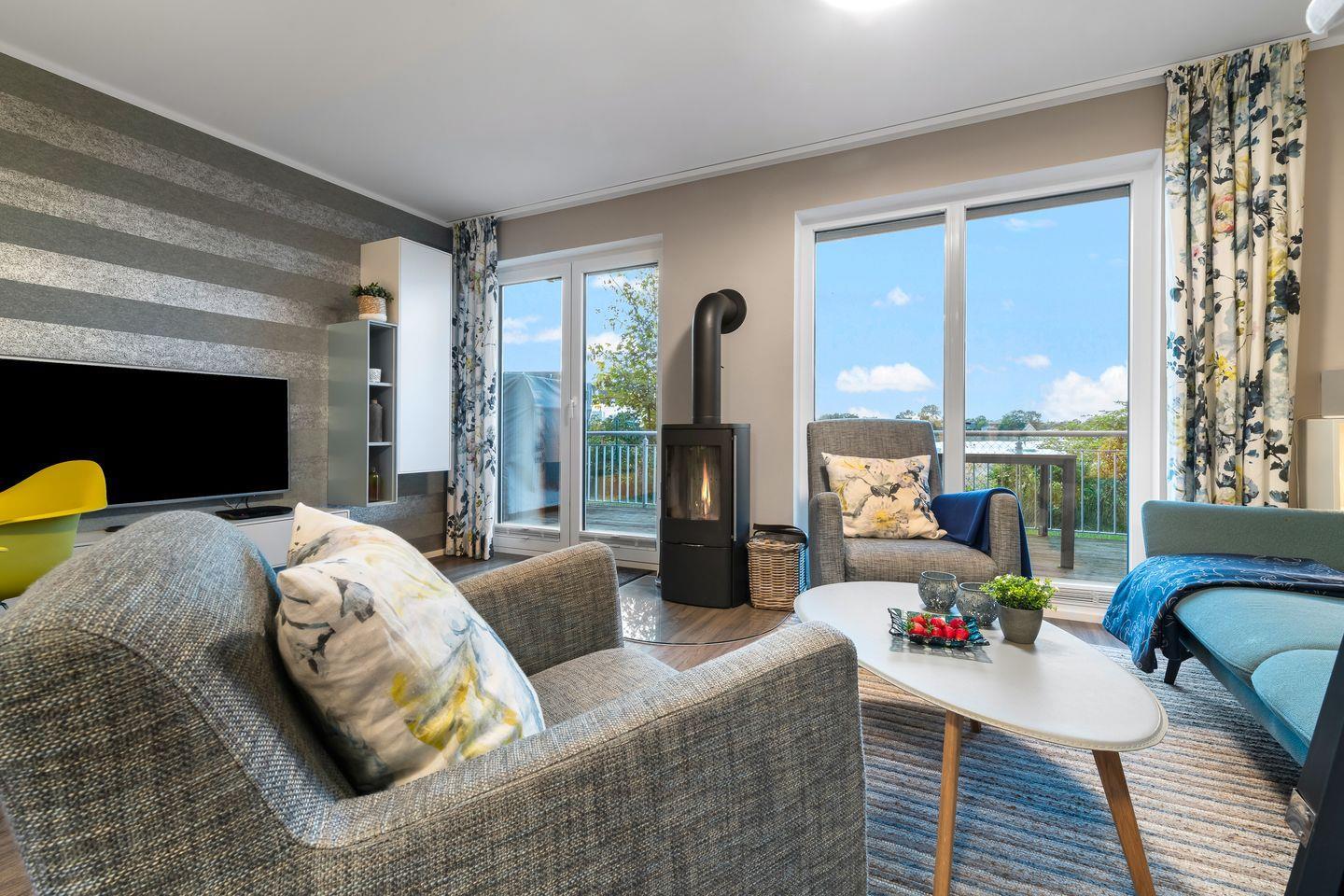 Die offene Kombination aus Essen und Wohnen erschließt sich auf der einen Seite durch die perfekt integrierte gut ausgestattete Küche und dem auf der anderen Seite befindlichen Ort des Geschehens – dem Wohnbereich. Eine gemütliche Wohnlandschaft, ein Kaminofen und der herrliche Blick auf das Wasser lassen jedes Urlauberherz höher schlagen.