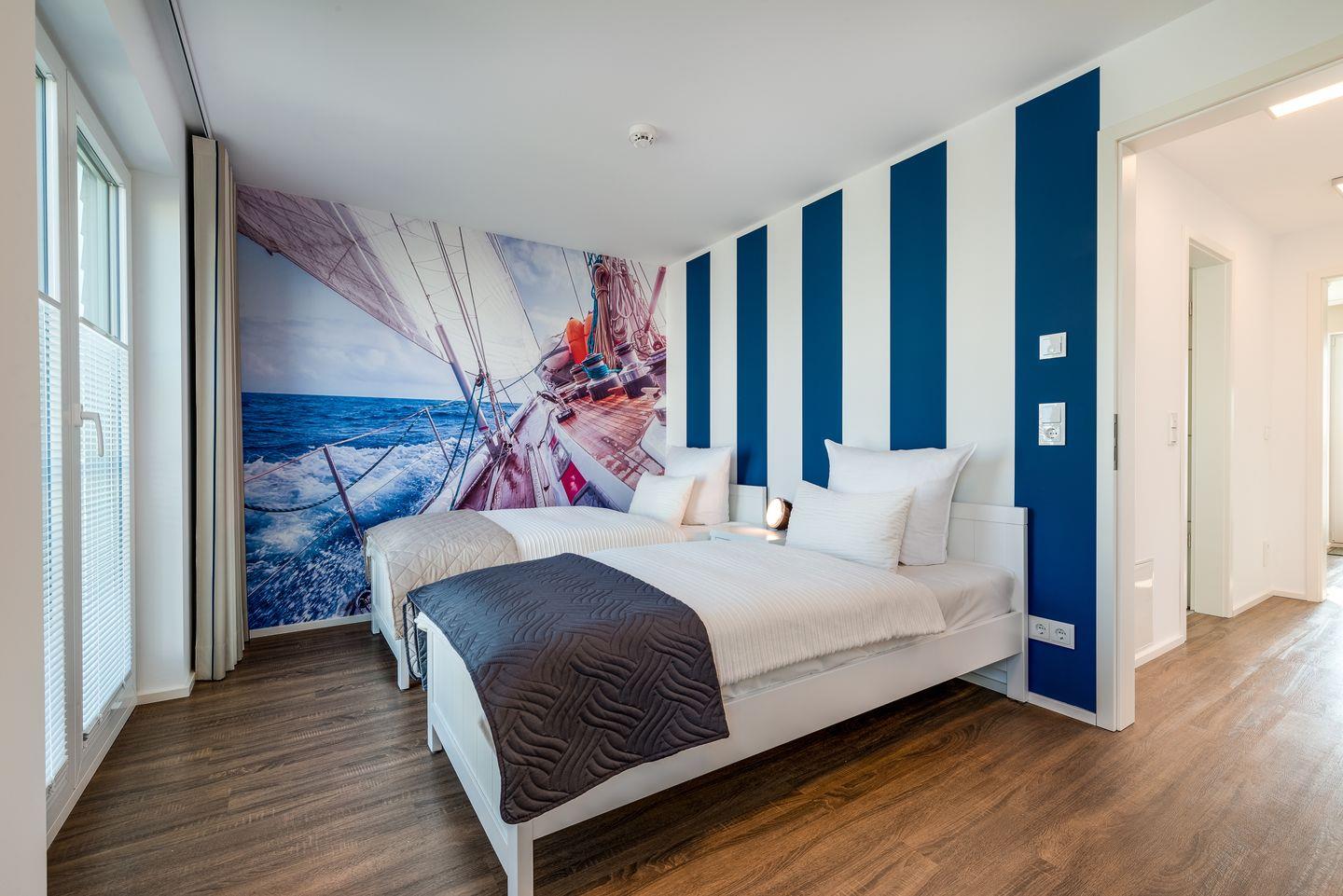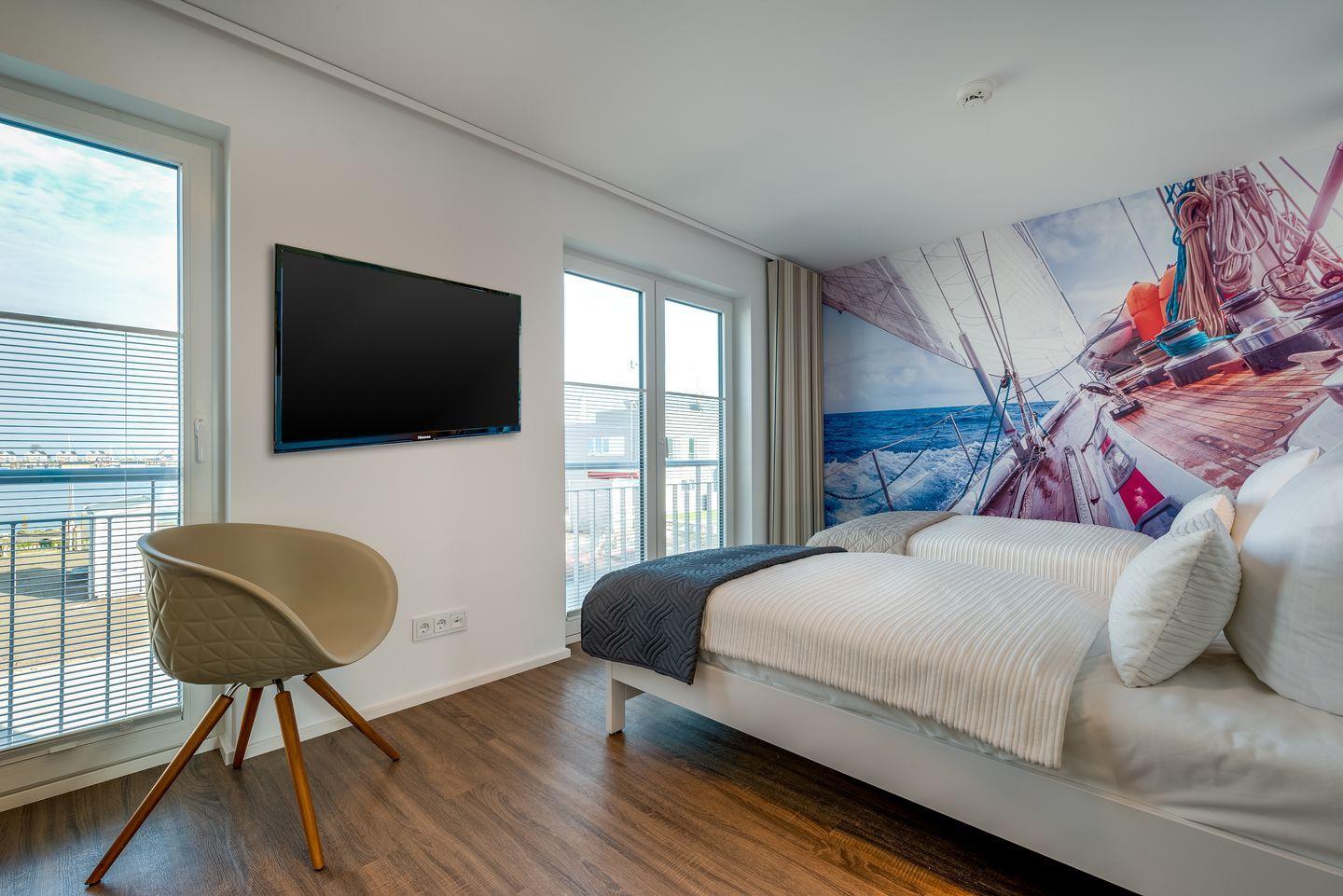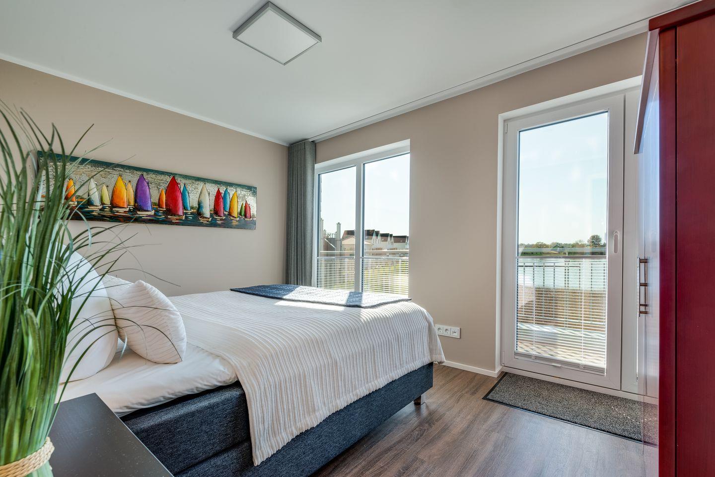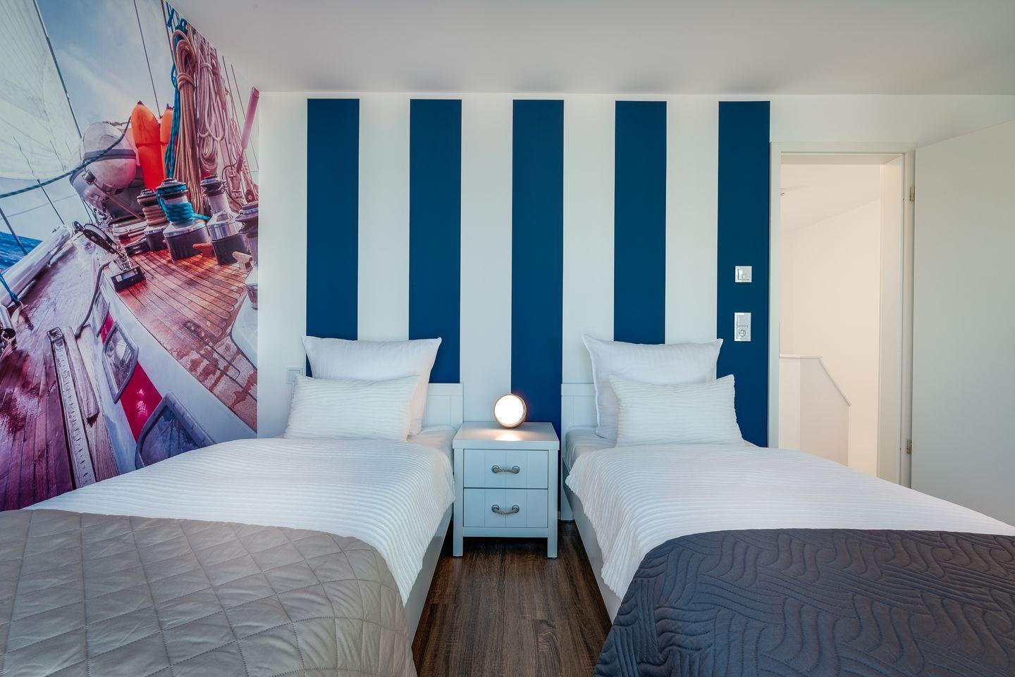Im ersten Obergeschoss erwarten unsere Gäste zwei Schlafzimmer mit Blick auf das Wasser. Ein Schlafzimmer ist mit 2 Einzelbetten und TV ausgestattet. Aus dem zweiten Schlafzimmer mit dem Doppelbett haben unsere Gäste den direkten Zugang auf den Balkon mit Blick auf die Schlei.