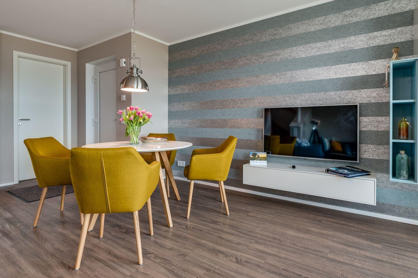 Die bodentiefen Fenster ermöglichen auch in der kalten Jahreszeit einen grandiosen Blick auf die Schlei, natürlich bei Kaminfeuer und einer leckeren Tasse Tee. Für Unterhaltung sorgt der große Flatscreen mit HomeEntertaiment. Das separate Gäste-WC befindet sich ebenfalls im Erdgeschoss.