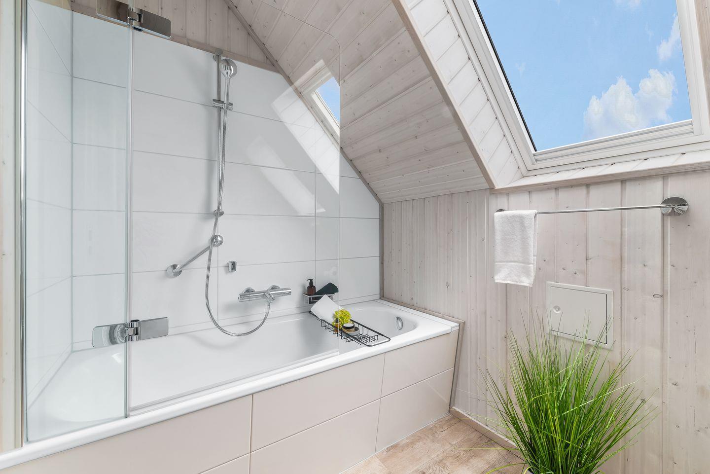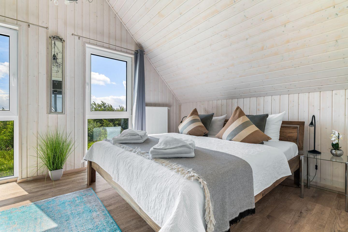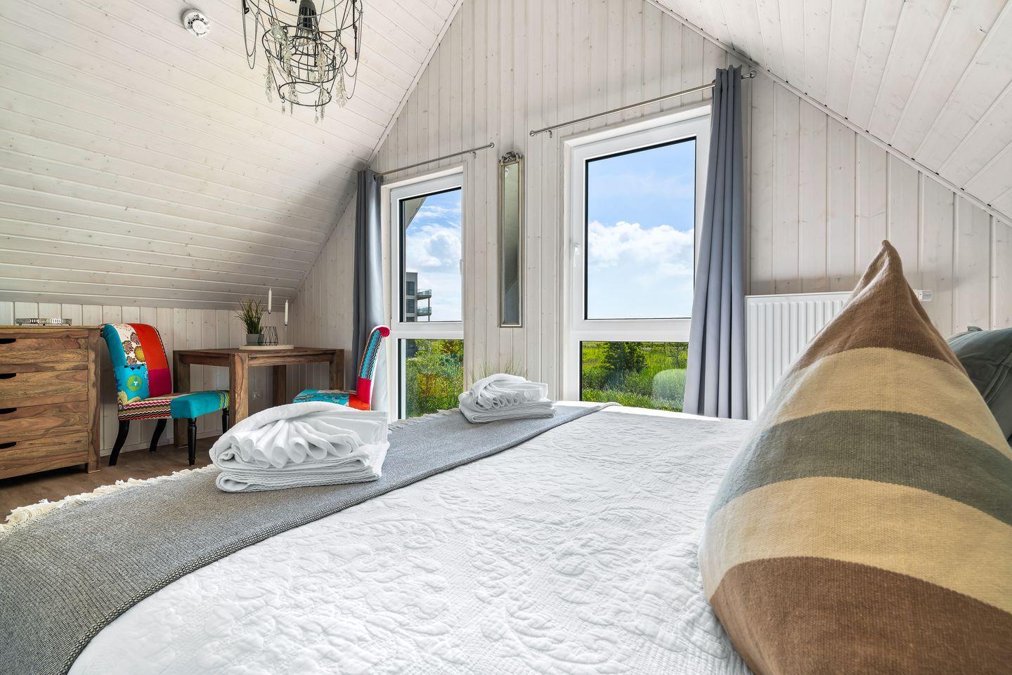 Die großzügigen Schlafzimmer im Obergeschoss mit bodentiefen Fenstern sorgen für ruhige Nächte. In einem davon sehen Sie vom Bett aus die Segelboote vorbeiziehen! Ein Schlafzimmer ist mit einem zweiten TV ausgestattet. Das Tageslichtbadezimmer mit Badewanne bietet zusätzlichen Komfort.