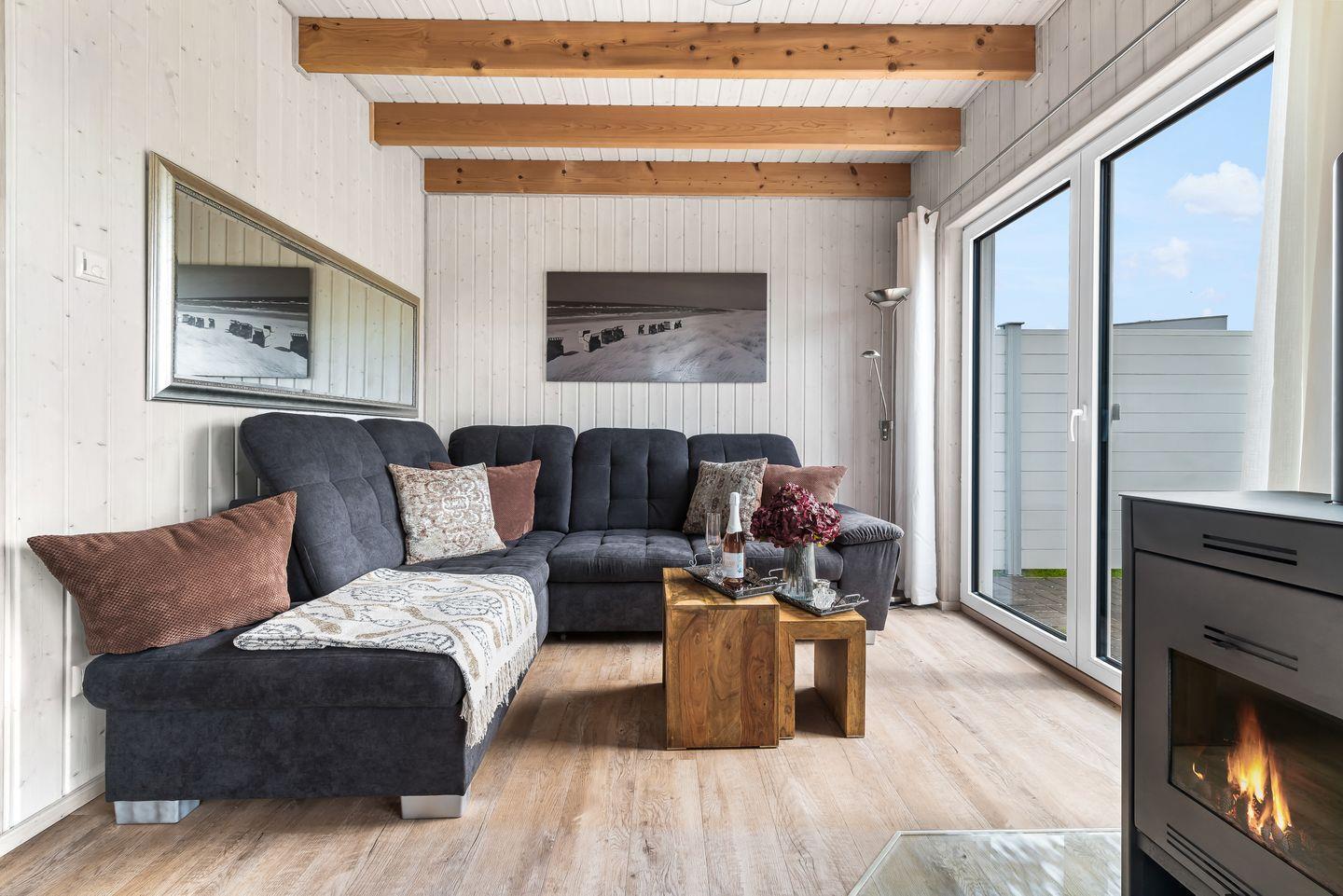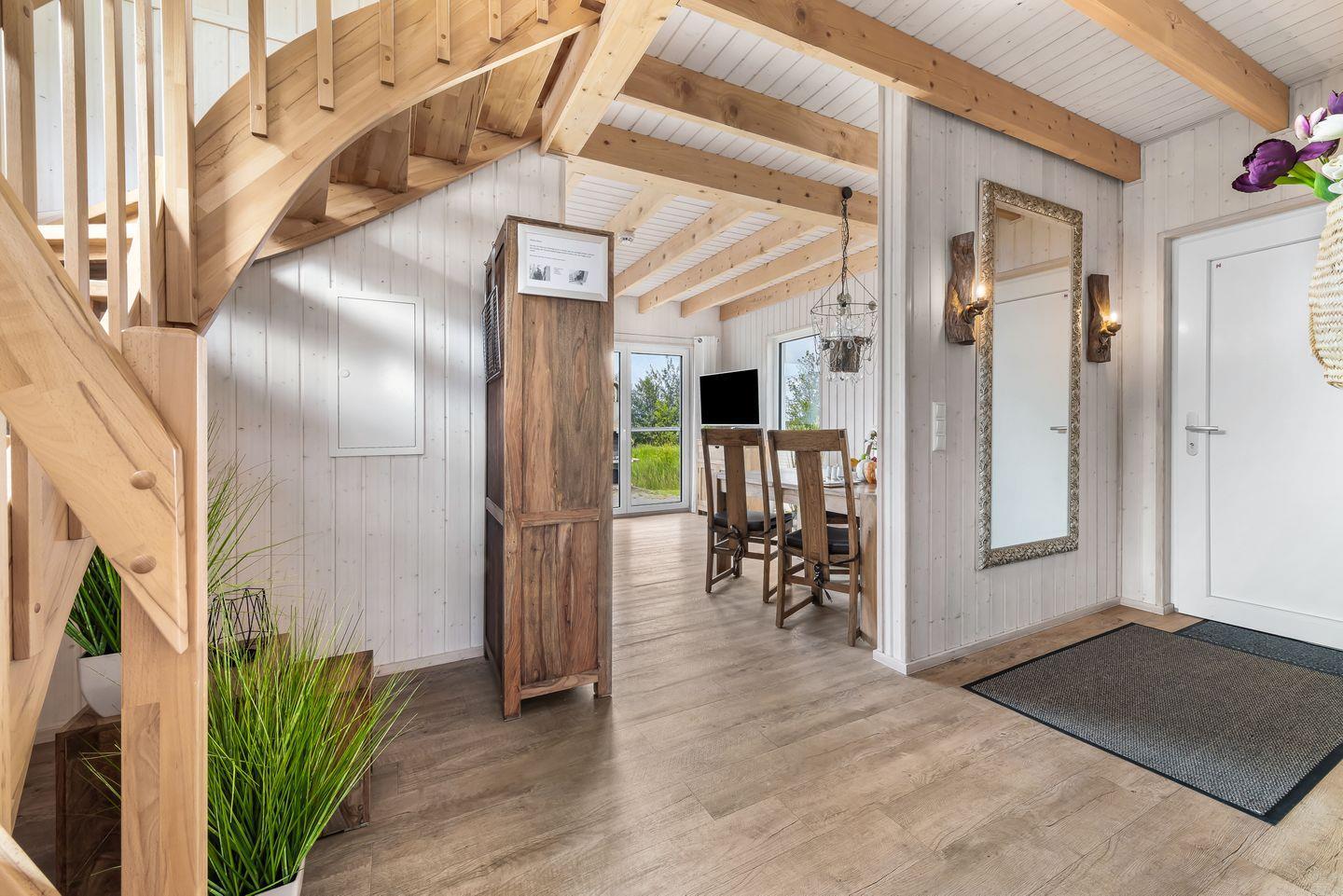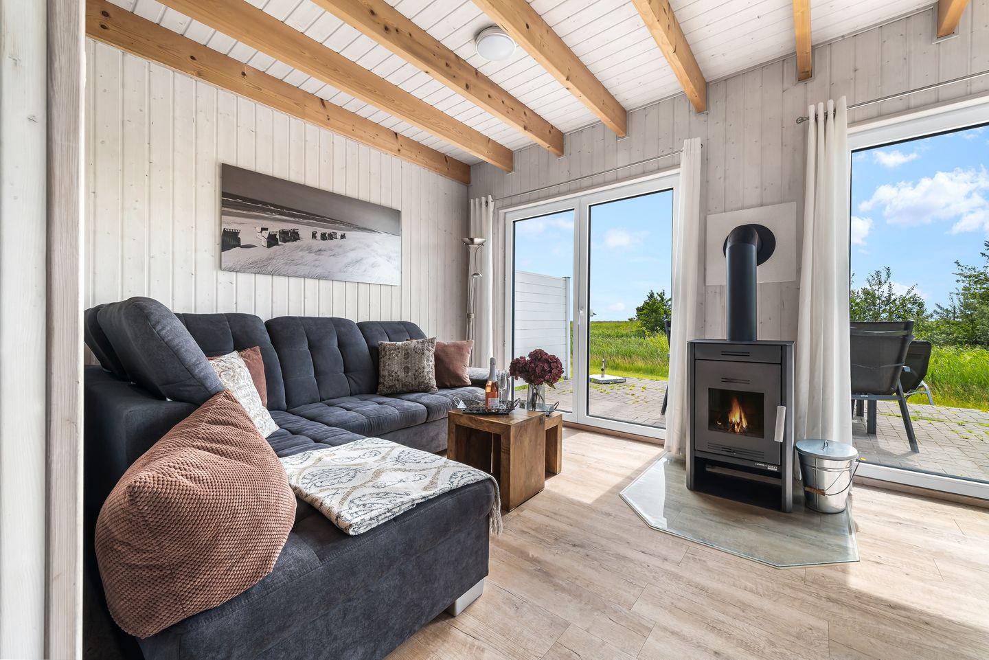 Empfangen werden Sie von einem großzügigen Entree im Erdgeschoss der "Strandlodge". Dort befindet sich auch der einladende Wohn-Essbereich mit einem Kamin, perfekt für gemütliche Abende. Die moderne Küche ist voll ausgestattet, inklusive Spül- und Waschmaschine für maximalen Komfort im Urlaub. Das Erdgeschoss beherbergt auch ein Badezimmer mit Dusche und einer privaten Infrarotsauna – ideal, um nach einem langen Spaziergang am nahegelegenen Strand zu entspannen.
