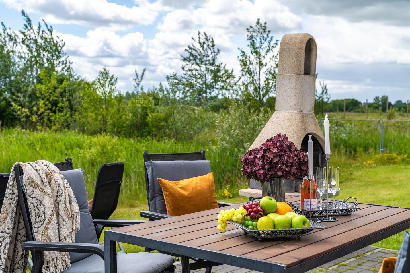Nicht weniger einladend ist die gemütliche Terrasse mit Kamin-Grill, der sich hervorragend für entspannte Sommerabende eignet. Genießen Sie hier Mahlzeiten im Freien oder einfach nur die ruhige Atmosphäre mit Blick auf die malerische Landschaft, gepaart mit dem Duft der Ostsee.