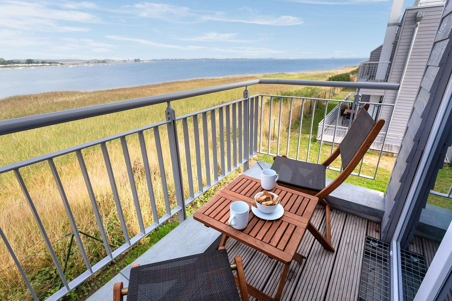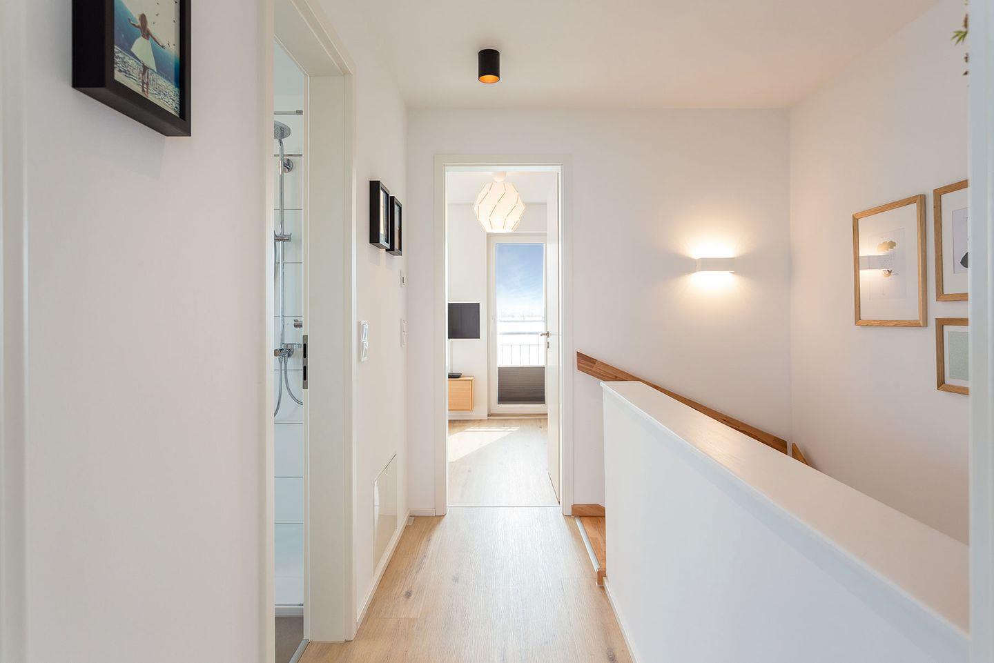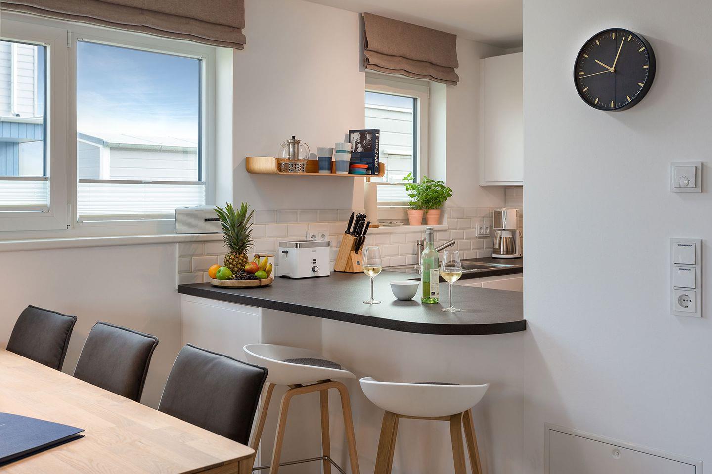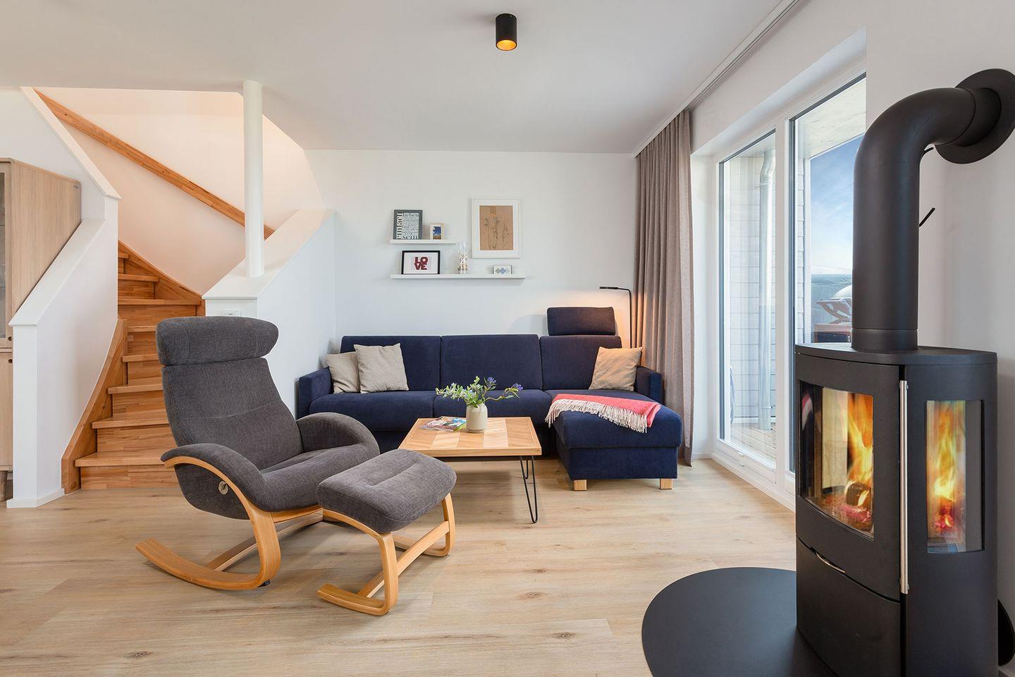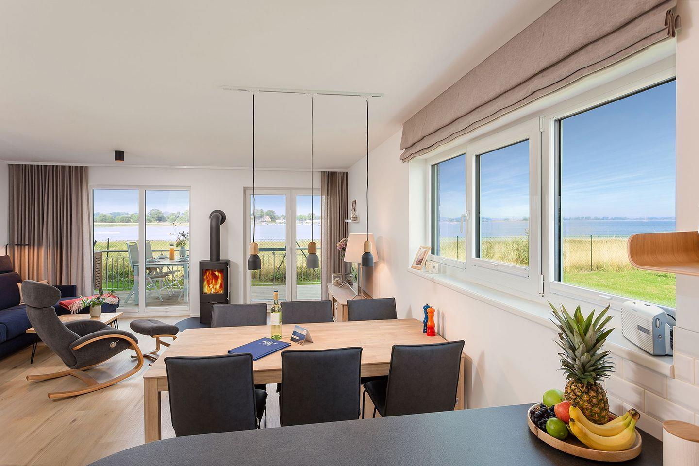 Das Ferienhaus "Meerliebe" besticht durch bodentiefe Panoramafenster, die alle Räume mit natürlichem Licht versorgen und den Blick auf das glitzernde Wasser freigeben. Der offene Wohn- und Essbereich im Erdgeschoss ermöglicht direkten Zugang zur Terrasse. Die vollausgestattete Küche mit Induktionsherd und hochwertigen Bosch-Geräten lädt zum Kochen ein. Ein Waschtrockner und eine Nespresso-Maschine stehen ebenfalls zur Verfügung.