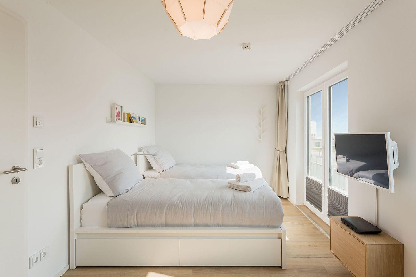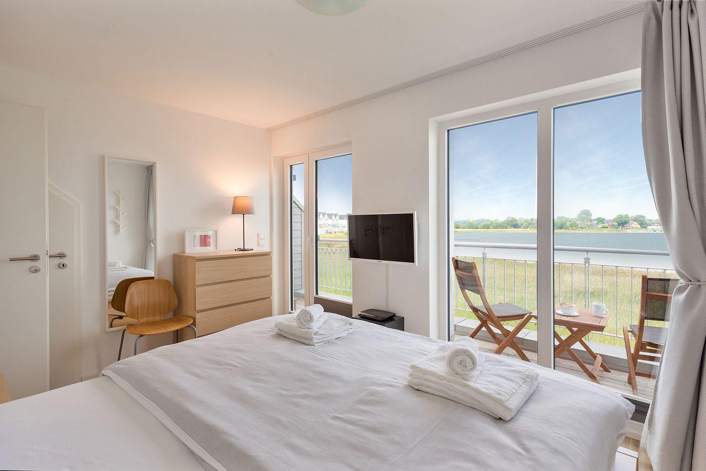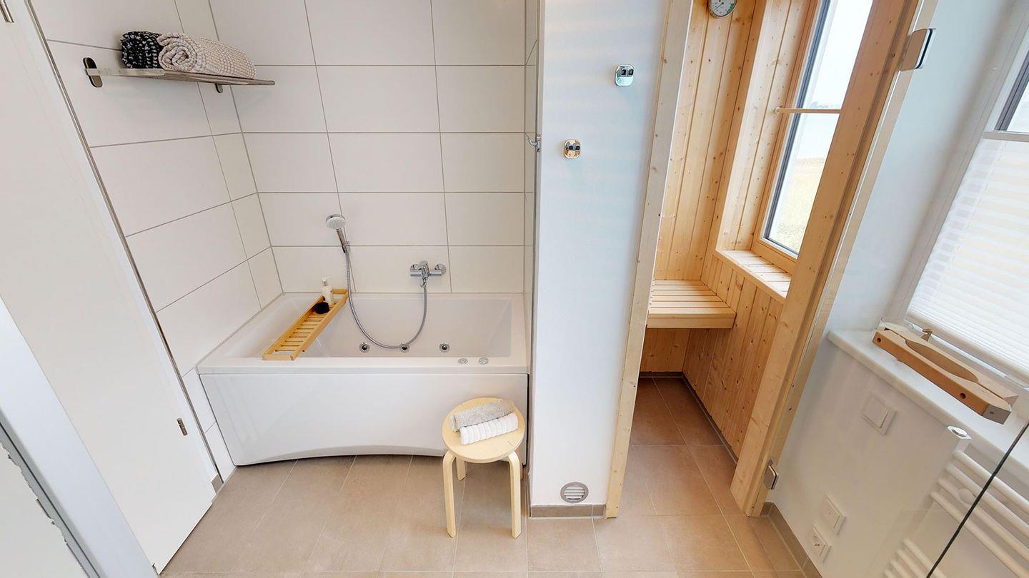Erleben Sie private Entspannungsmomente in der finnischen Sauna mit Wasserblick oder relaxen Sie in Whirlwanne. Der Ruhebereich im ersten Obergeschoss umfasst zwei stilvolle Schlafzimmer, jedes ausgestattet mit TV und herrlicher Aussicht – das Hauptschlafzimmer sogar mit direktem Terrassenzugang und freiem Blick auf die Schlei.