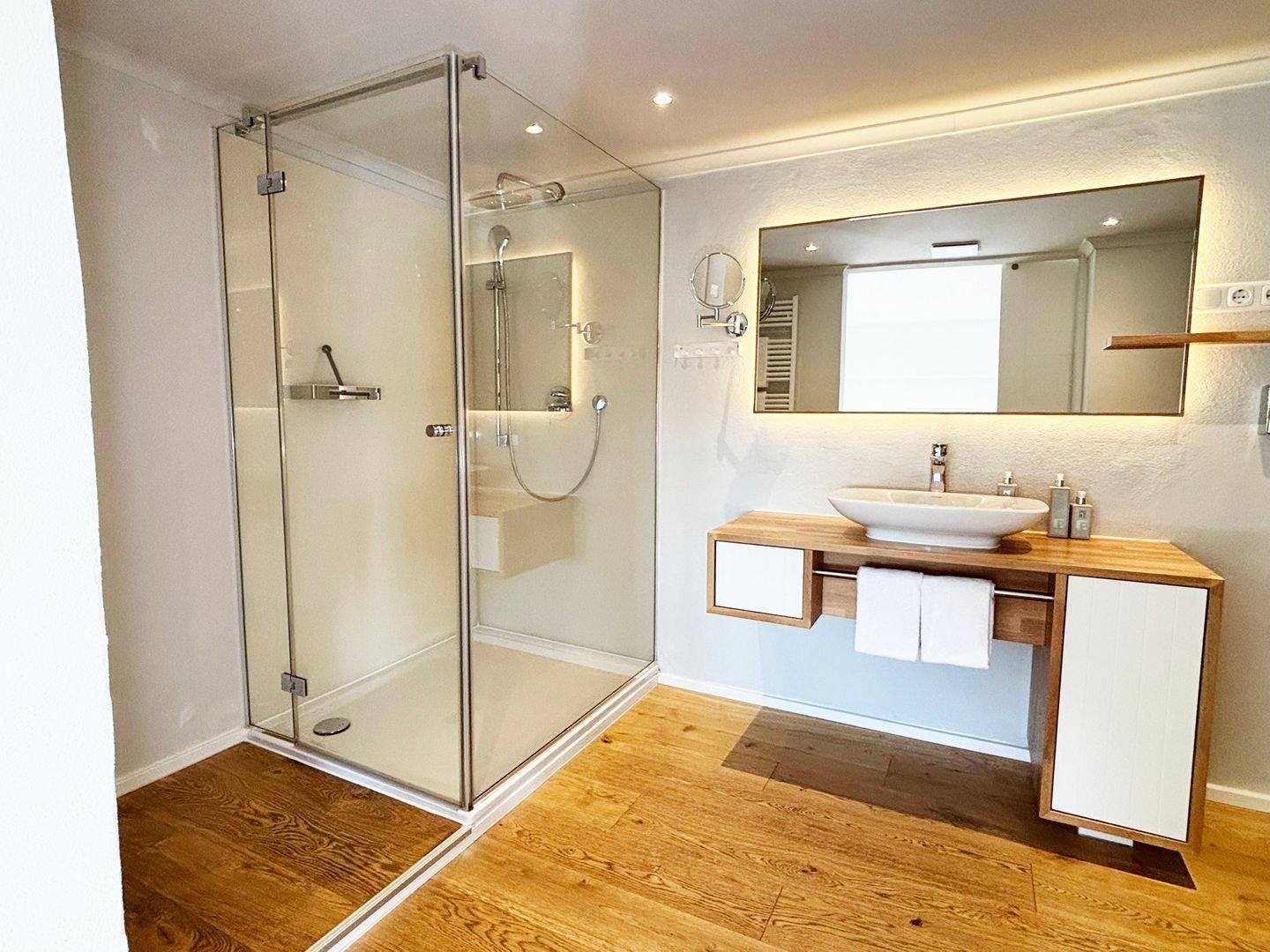 Das Badezimmer grenzt direkt an den Schlafbereich, es verfügt über eine ebenerdige Dusche, WC, Waschbecken, Haartrockner und Kosmetikspiegel.