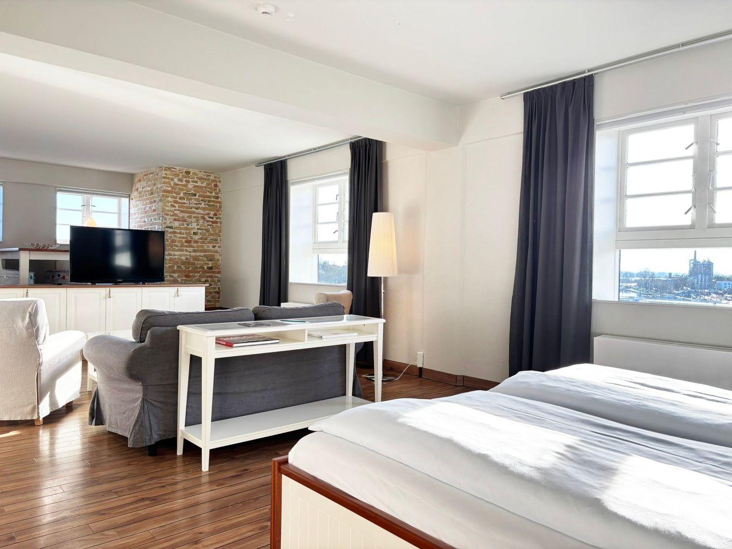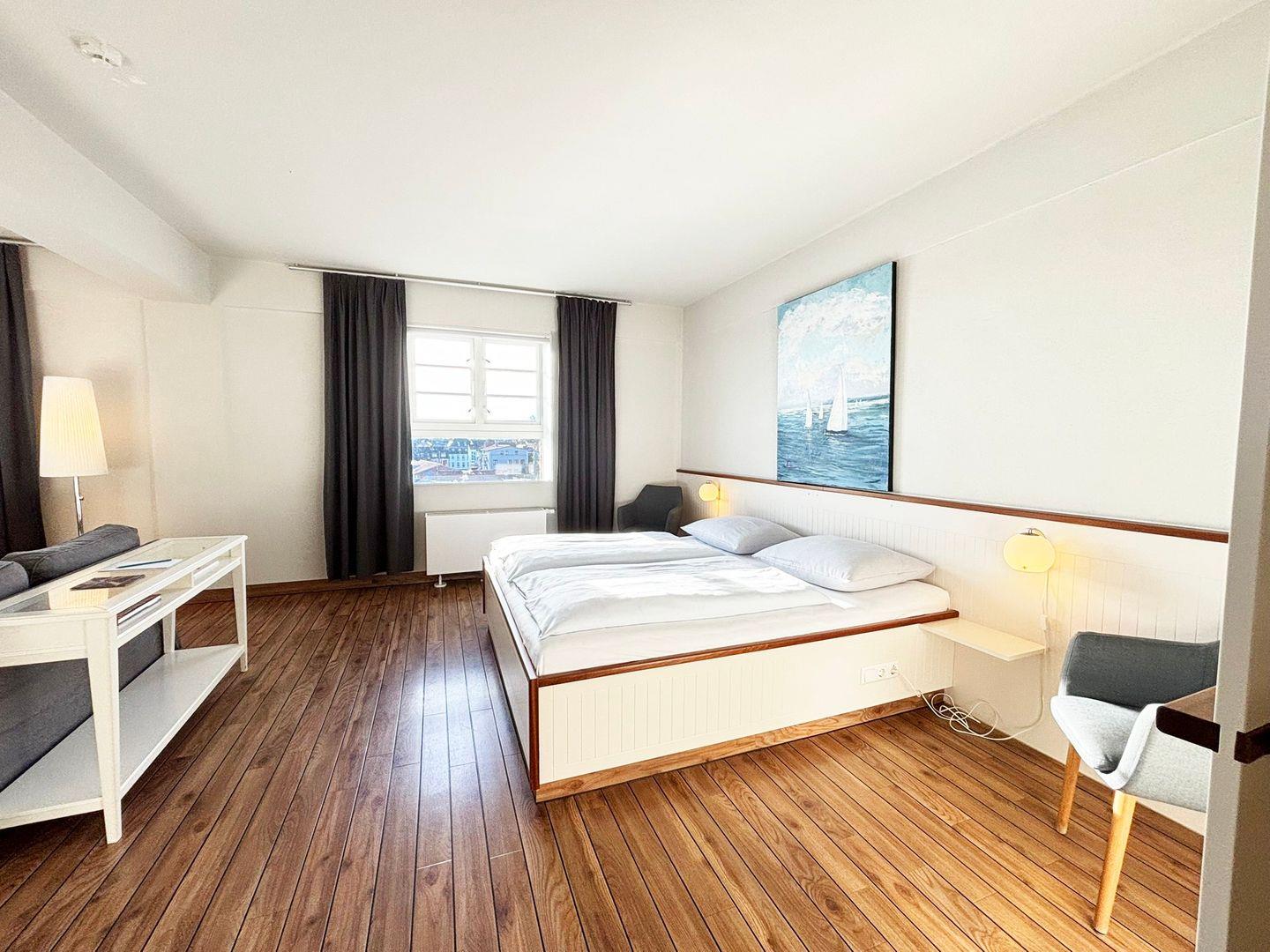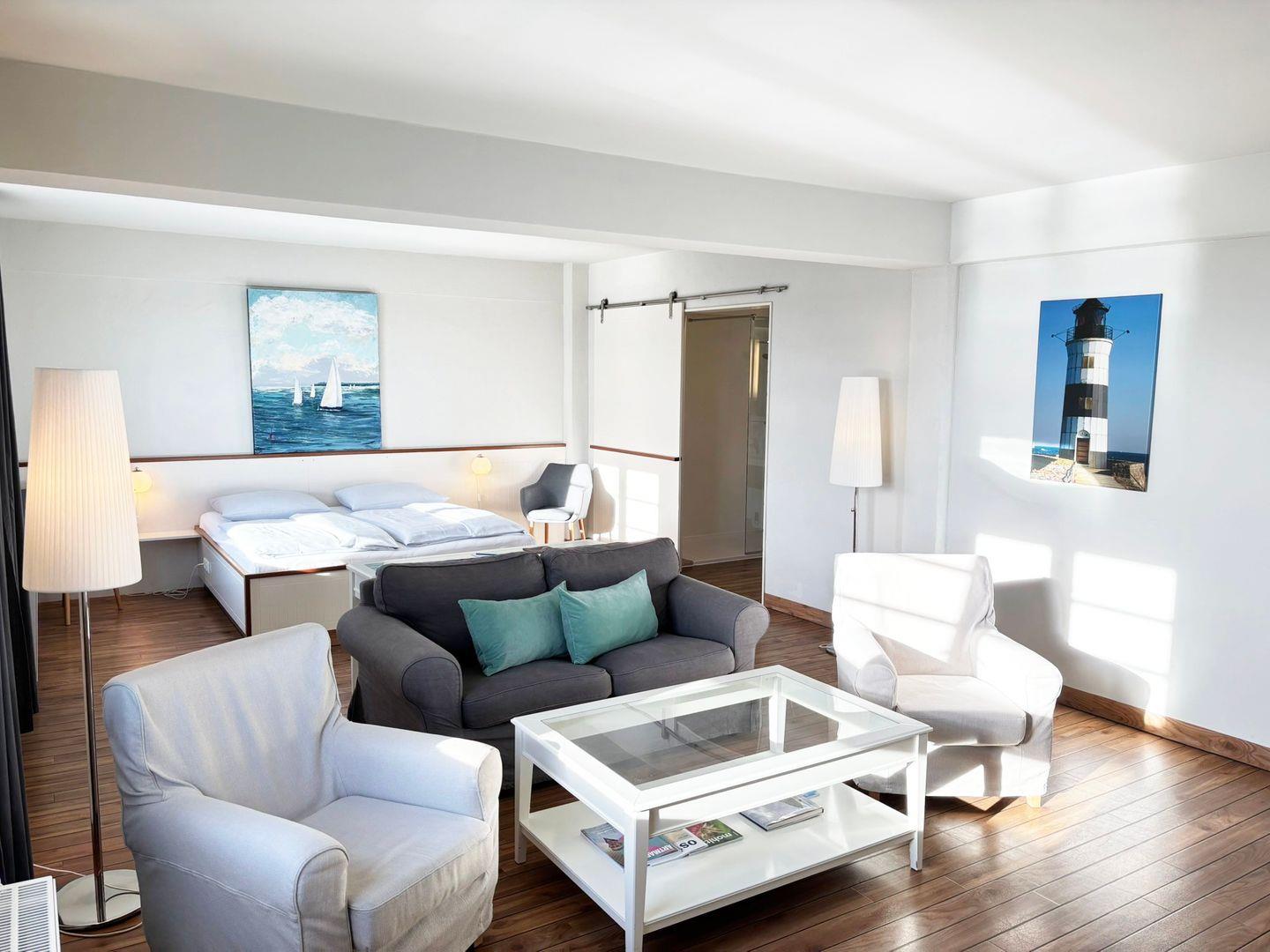 Das Appartement befindet sich in der fünften Etage des Pierspeichers und ist bequem über einen Aufzug oder das Treppenhaus erreichbar. Hier finden Sie einen einladenden Essbereich, eine gemütliche Sitzecke sowie eine praktische Pantryküche. Der offene Wohnbereich lädt mit einem bequemen Sessel und einem Sofa zum Entspannen ein.