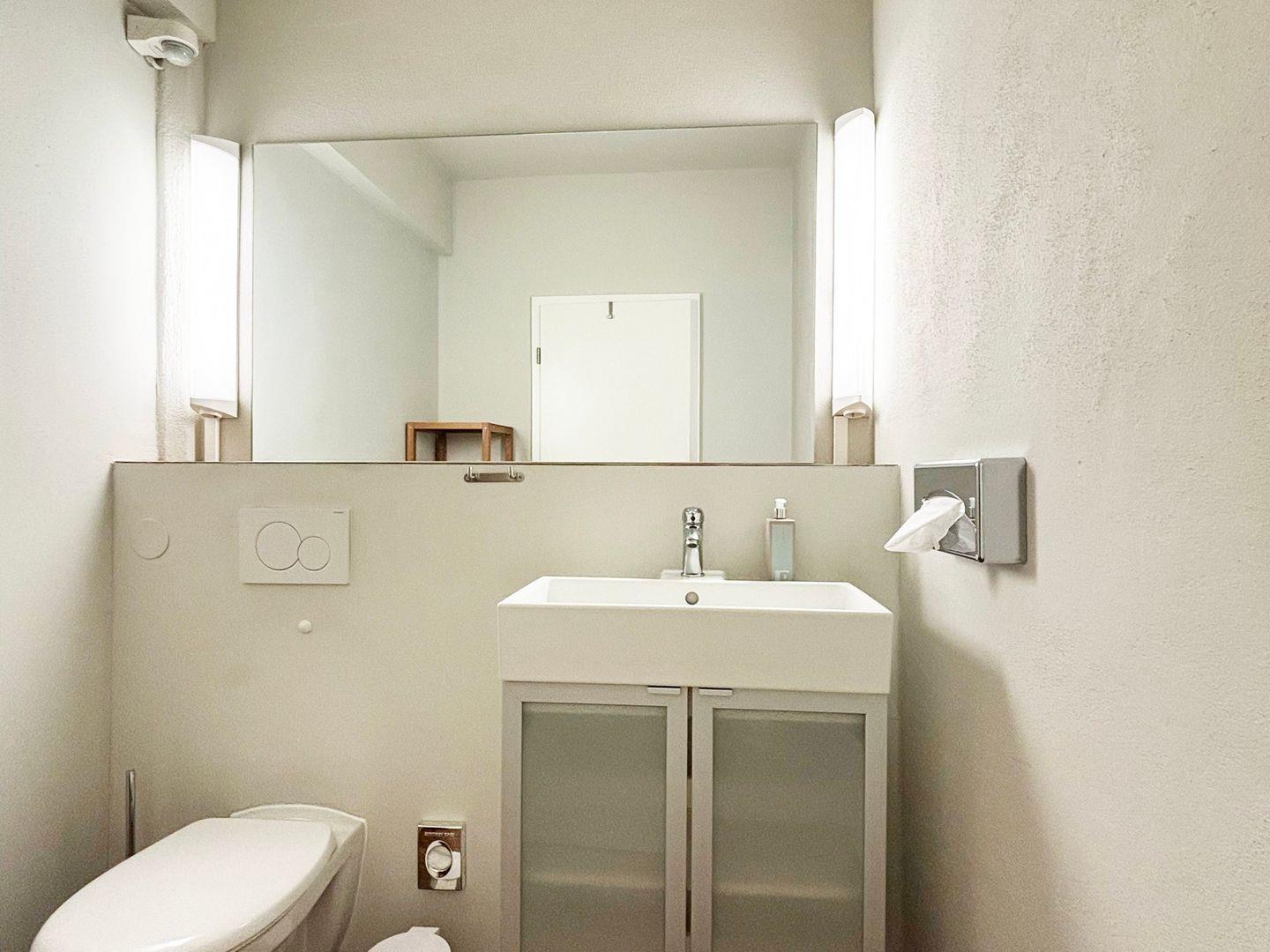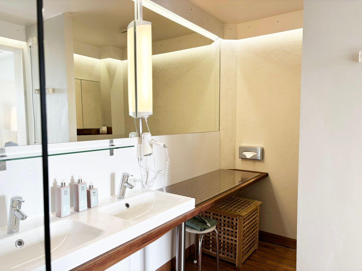 Das angrenzende Badezimmer ist modern ausgestattet mit einer ebenerdigen Dusche, WC, Waschbecken, Haartrockner und Kosmetikspiegel – alles für Ihr Wohlbefinden. Zudem verfügt das Appartement über ein separates Gäste-WC.