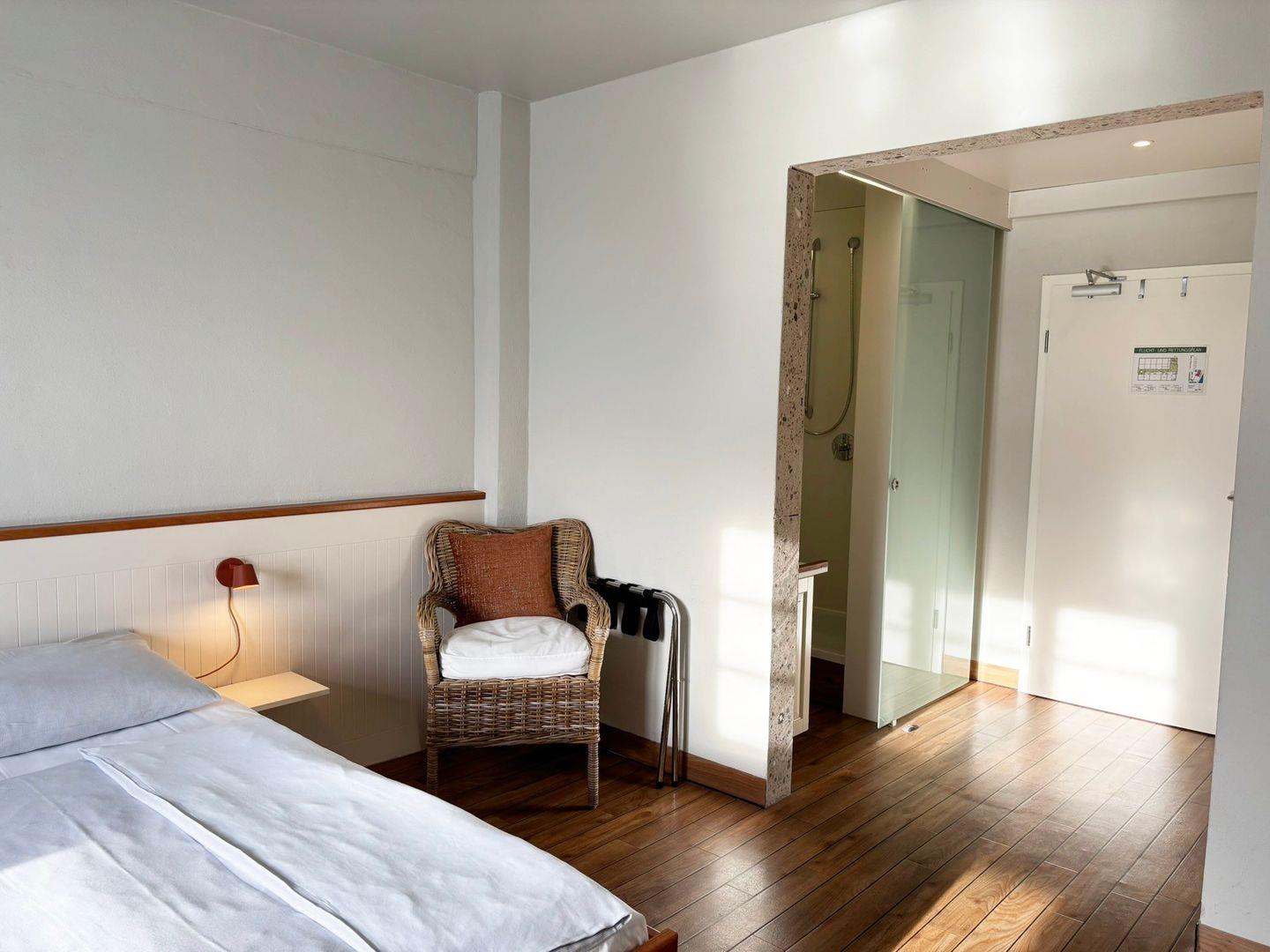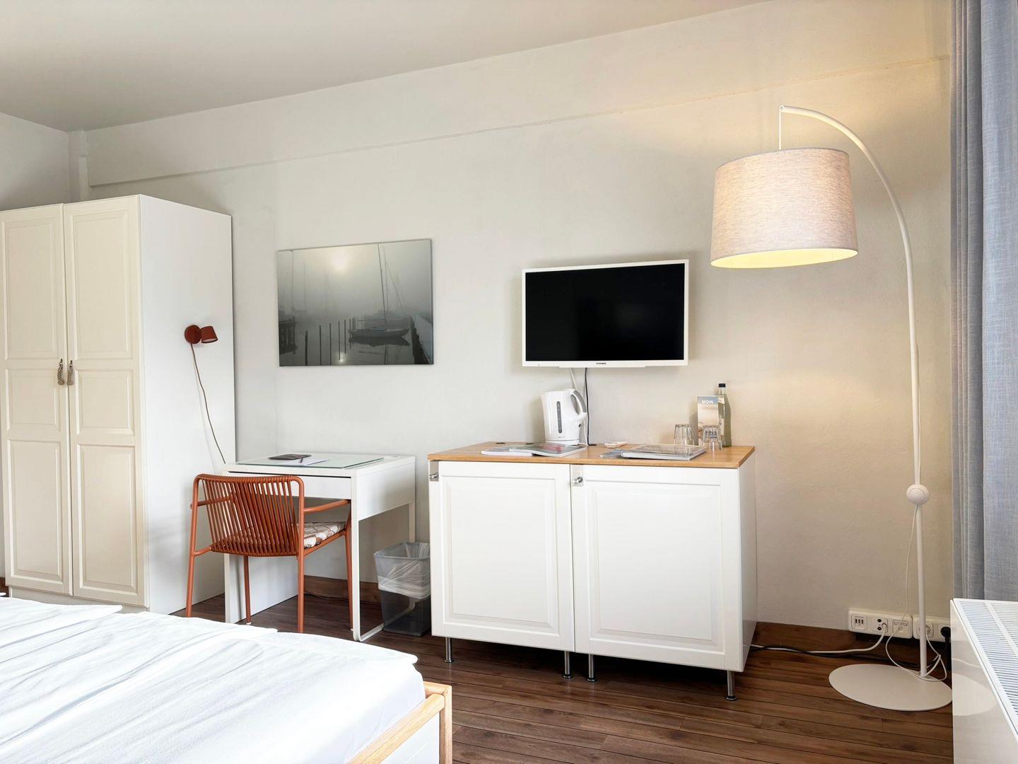 Das Appartement liegt in der vierten Etage des Pierspeichers und ist bequem über einen Aufzug oder das Treppenhaus erreichbar. Das Zimmer ist ausgestattet mit einem Doppelbett (180x200cm) mit getrennten Matratzen und offenem Fußende, Kleiderschrank, Verdunklungsmöglichkeit, Safe, zwei Korbsesseln und einem TV-Gerät.