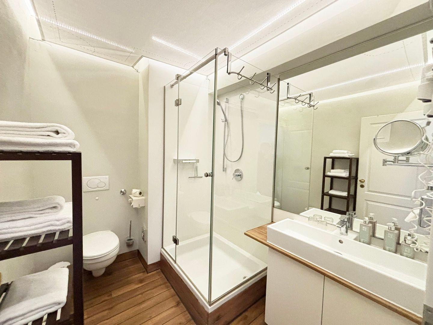 Das Badezimmer verfügt über ein WC, Dusche, Waschbecken, sowie einen Kosmetikspiegel, Spiegel und Haartrockner.
