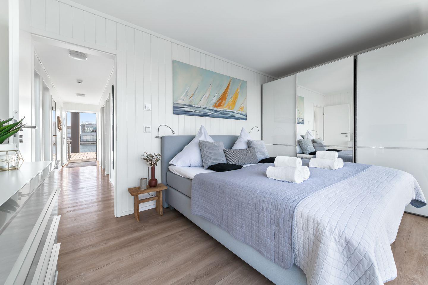 Ruhe und Komfort auf dem Wasser: Das Wasserhaus "Natea", ein Ort der Entspannung, erstreckt sich über zwei Etagen. Im Erdgeschoss befinden sich zwei Schlafzimmer: Der Hauptschlafraum bietet ein gemütliches Boxspringbett, einen großen Kleiderschrank und einen Fernseher. Eine große Glasfront eröffnet den Blick und Zugang zur Terrasse direkt am Wasser. Das zweite Schlafzimmer verfügt über zwei komfortable 90 cm-Betten, einen Schrank und ebenfalls einen Fernseher. Eine kleine finnische Sauna und ein modernes Duschbad runden die Ausstattung ab.