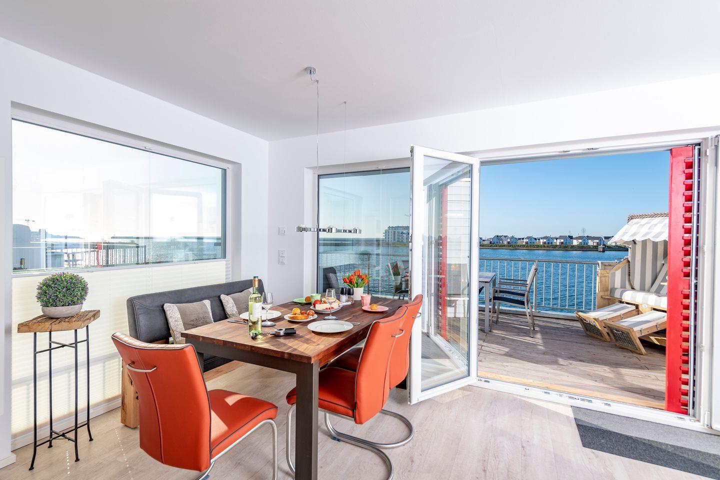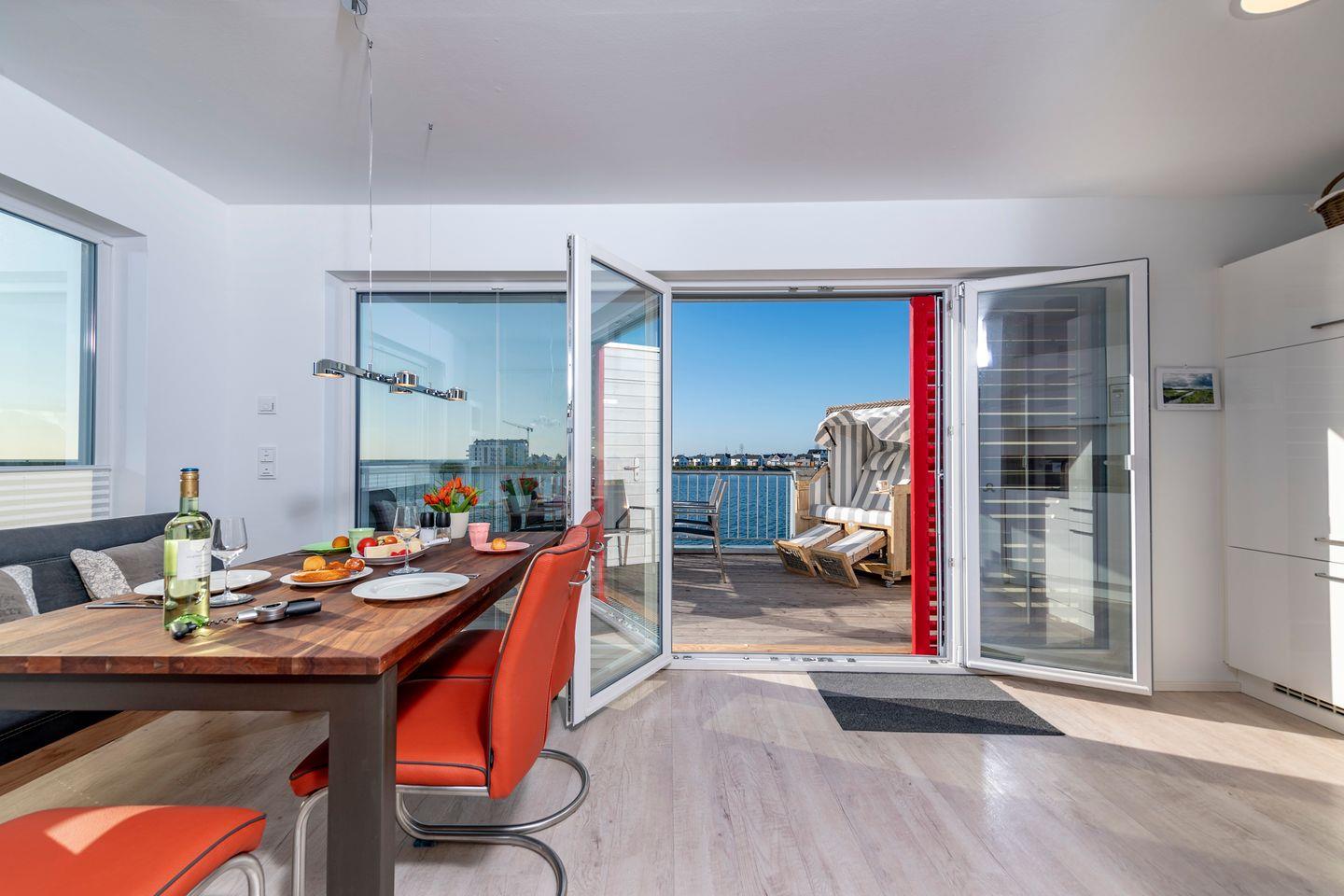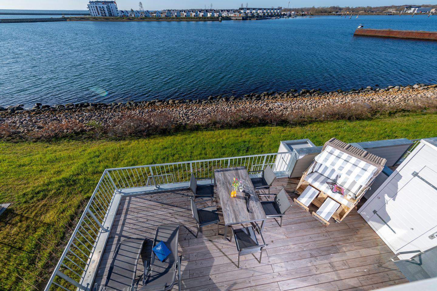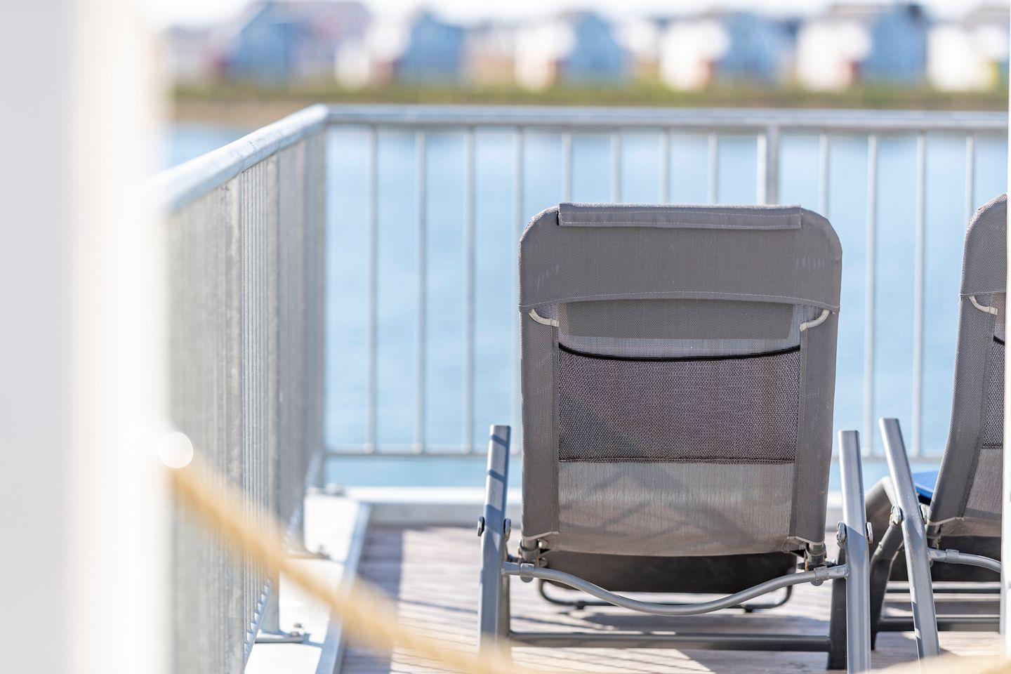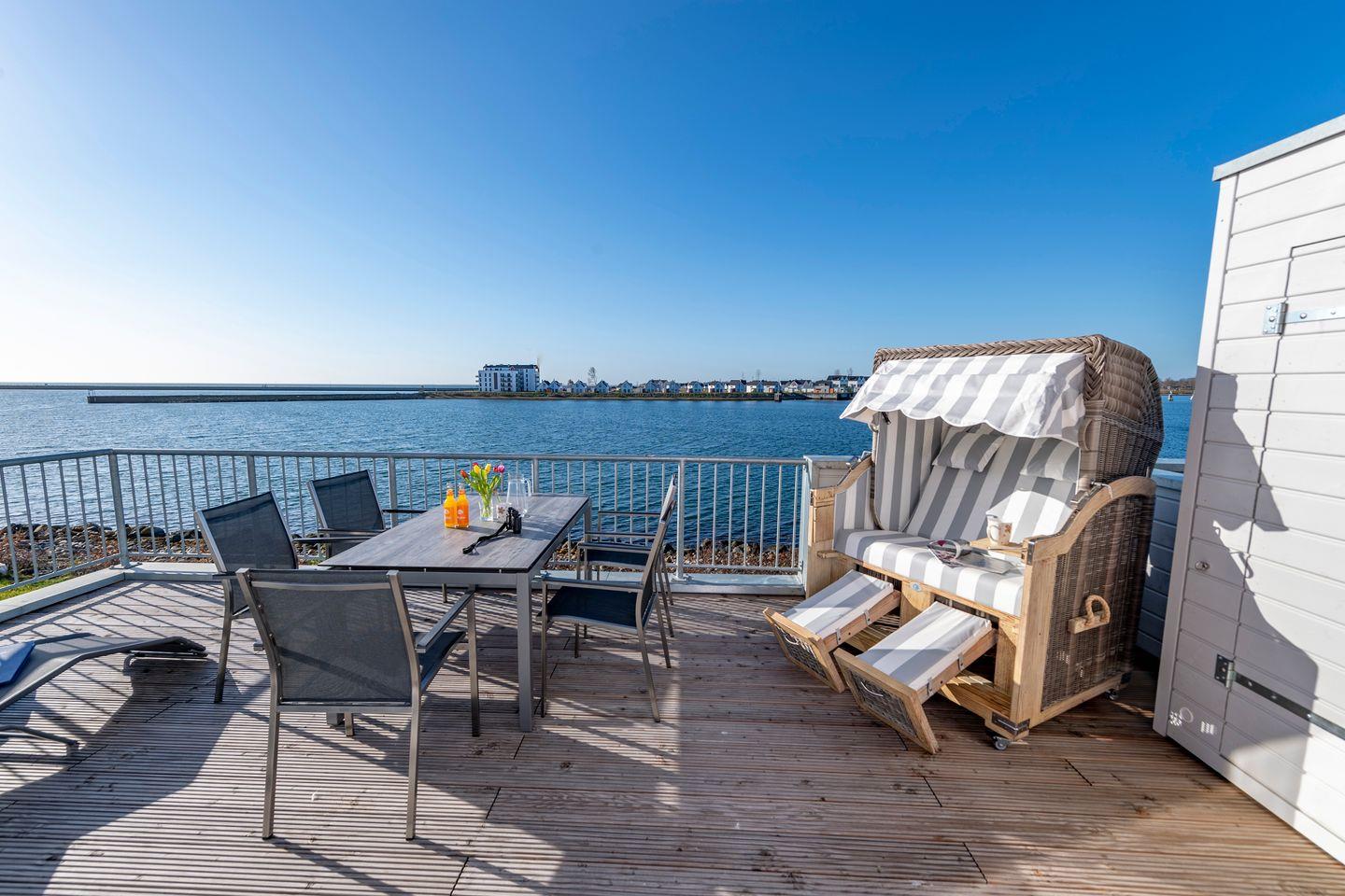 Der Balkon mit direktem Meerblick lädt zu jeder Tageszeit zum Verweilen ein. Sonnenliegen und ein Strandkorb steigern das Urlaubsgefühl.