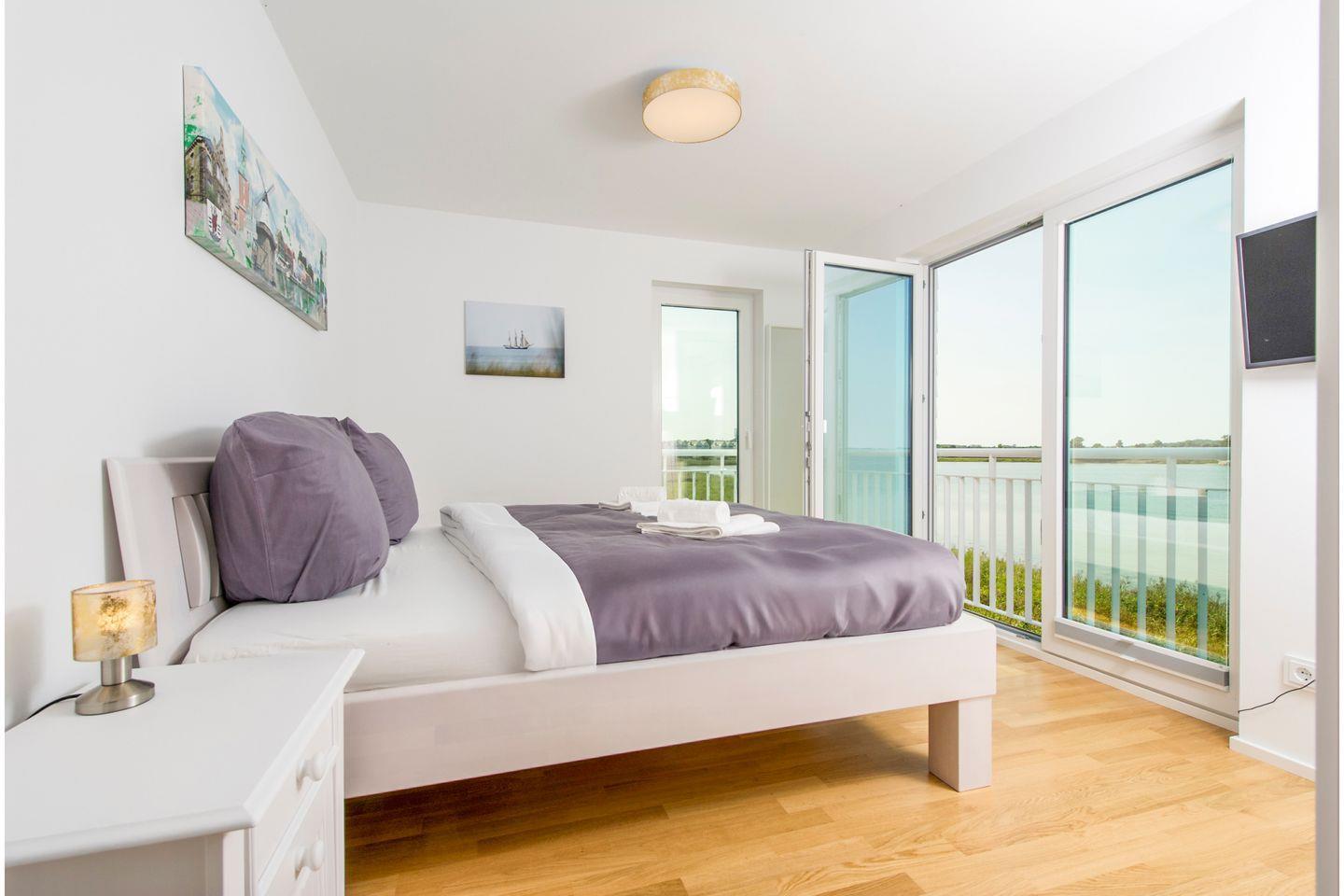 Im ersten Obergeschoss befinden sich zwei Schlafzimmer. Das Hauptschlafzimmer mit Doppelbett öffnet sich zur Terrasse mit Blick auf die Schlei. Das zweite Schlafzimmer ist flexibel: zwei Einzelbetten, die sich bei Bedarf zusammenschieben lassen. Große Fenster holen das Wasser fast bis ans Bett.