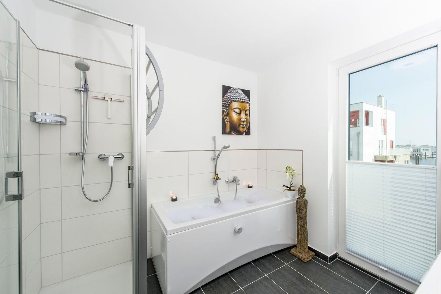 Die Whirlpool Badewanne im Badezimmer ist mehr als nur ein Highlight. Wer hier badet, blickt über die Schlei und fühlt sich dem Wasser ganz nah. Das ist Wellness pur. Noch dazu wartet im Dachgeschoss eine finnische Sauna mit großzügiger Dusche auf Sie. Nach einem langen Spaziergang an der Ostsee der perfekte Ort zum Aufwärmen.