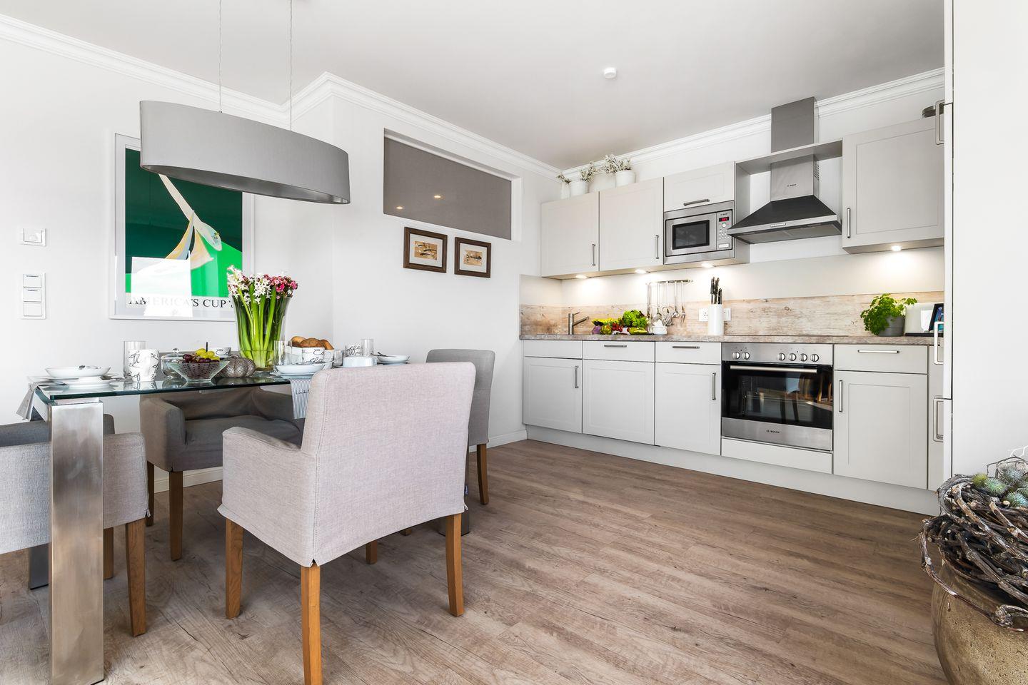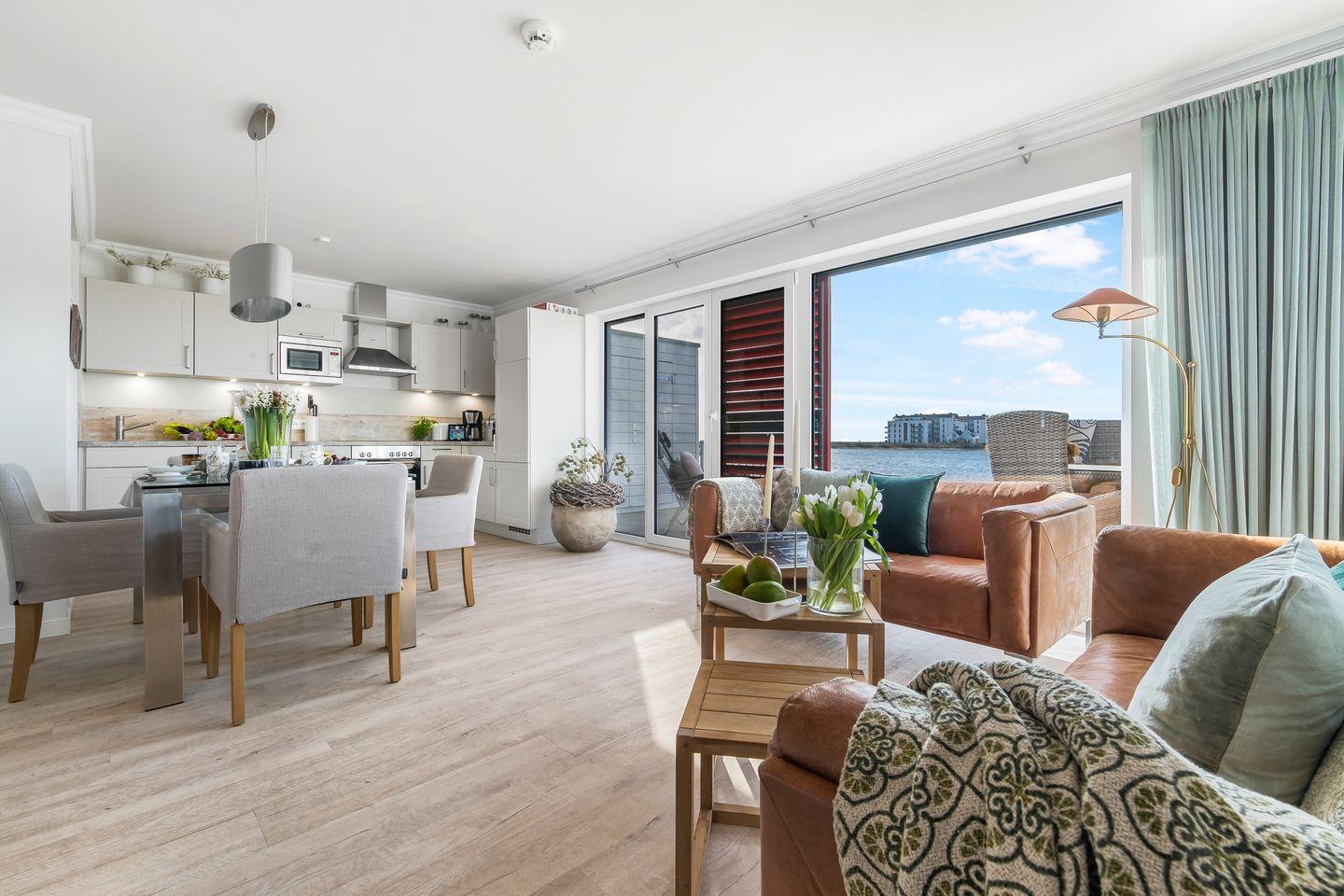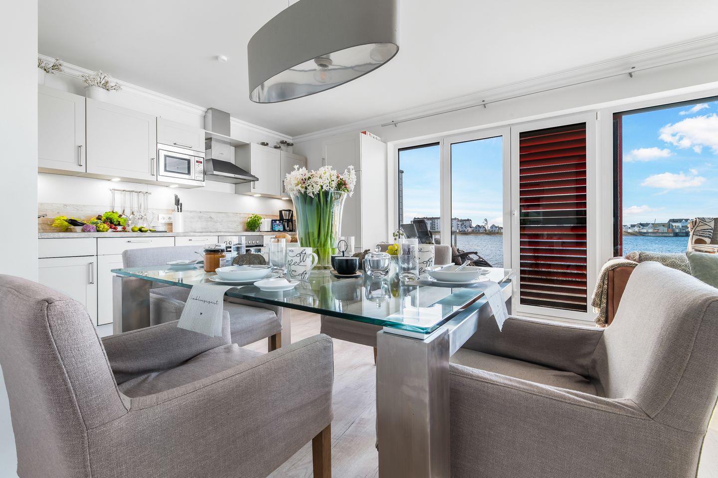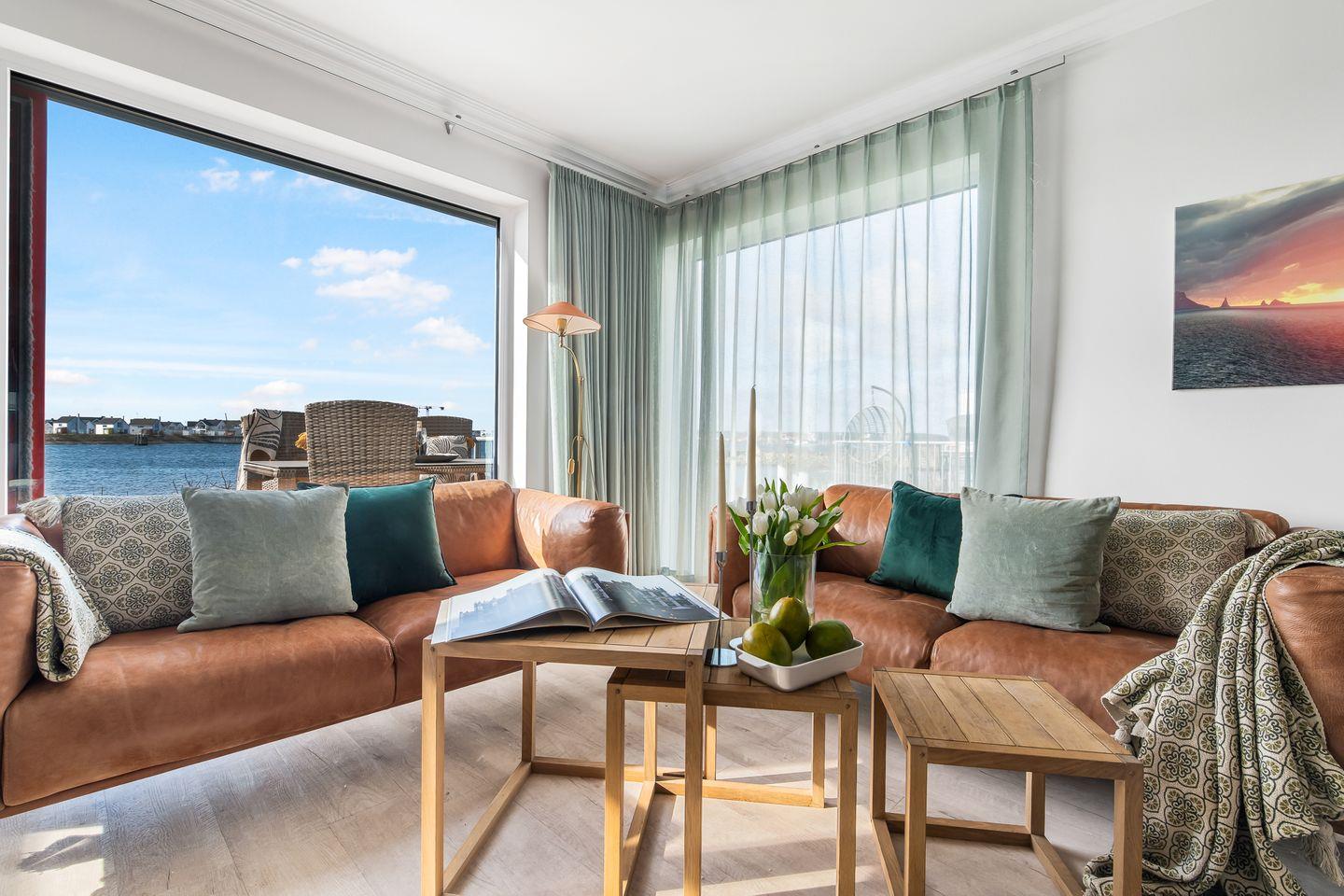 Die bodentiefen Fenster im Wohn-Essbereich holen das Panorama direkt ins Herz der Wohnung. Morgens wärmt die erste Sonne die Südterrasse, während sanfte Wellen am Kai schaukeln. Abends spiegelt sich das Licht der untergehenden Sonne im Wasser – dazu ein Glas Wein und das sanfte Hafenkino vor der Tür.