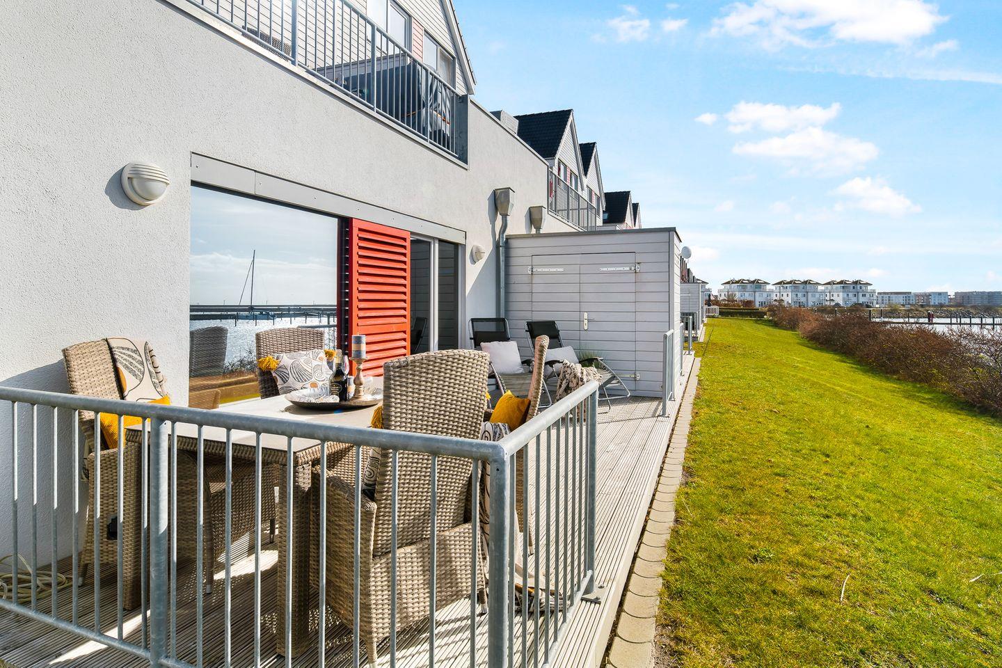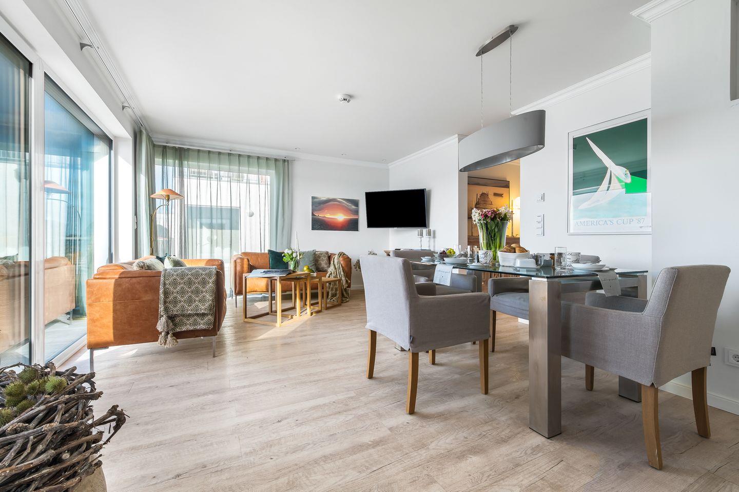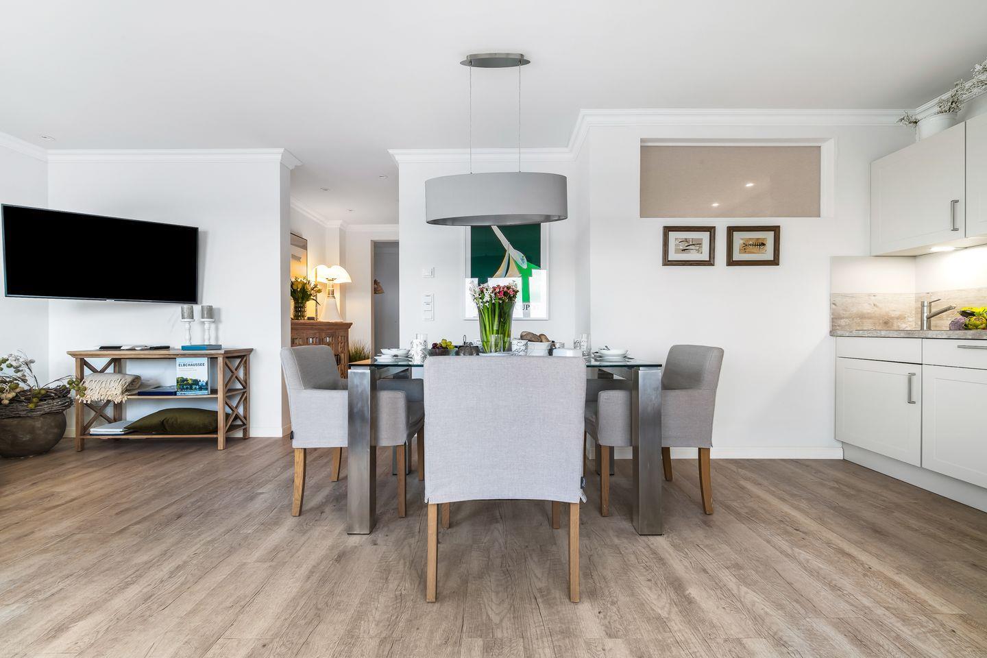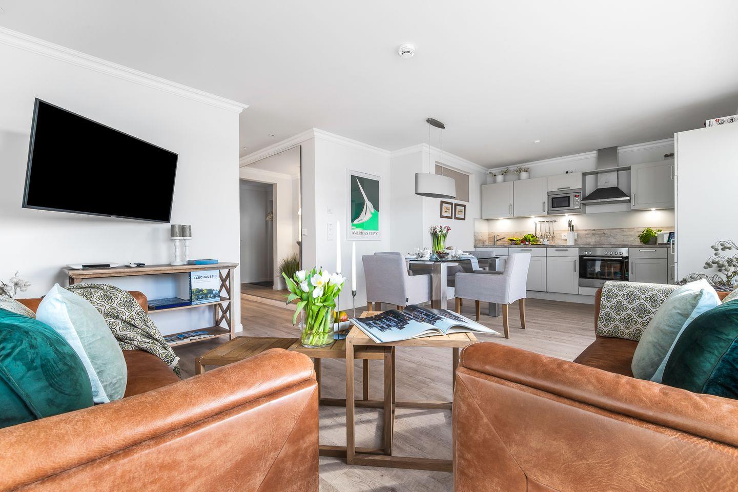 Die bodentiefen Fenster im Wohn-Essbereich holen das Panorama direkt ins Herz der Wohnung. Morgens wärmt die erste Sonne die Südterrasse, während sanfte Wellen am Kai schaukeln. Abends spiegelt sich das Licht der untergehenden Sonne im Wasser – dazu ein Glas Wein und das sanfte Hafenkino vor der Tür.