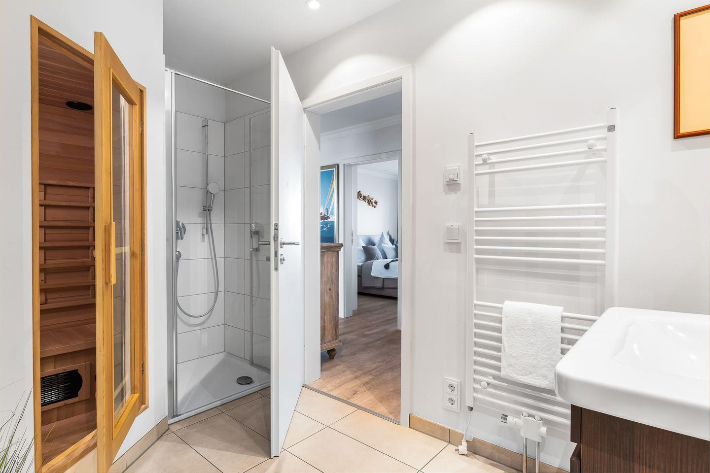 Nach einem langen Strandspaziergang locken die kleinen Oasen der Entspannung: Die Infrarot-Wärmekabine mit Soundsystem oder die sprudelnde Whirlwanne schenken wohltuende Momente. Dazu sorgt die Fußbodenheizung das ganze Jahr hindurch für wohlige Wärme.