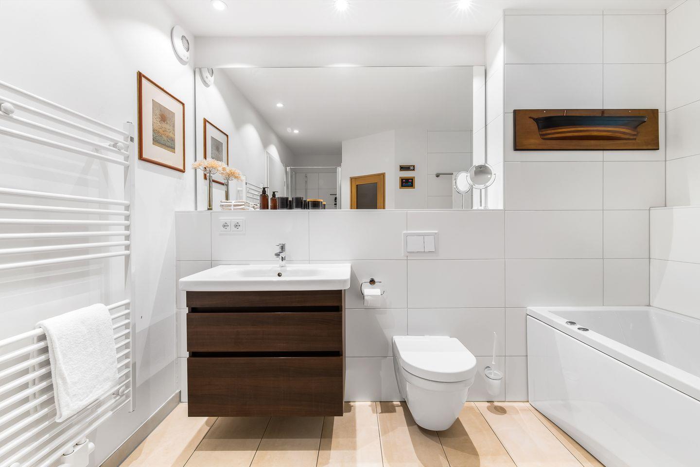 Die Wohnung im Erdgeschoss verfügt über ein modernes Bad mit Dusche und Wanne sowie ein Gäste-WC. Waschmaschine, Geschirrspüler und kostenfreies WLAN sind selbstverständlich vorhanden. Ein eigener Parkplatz mit E-Ladestation (verbrauchsabhängige Abrechnung) sowie ein Fahrradschuppen ergänzen den Komfort.