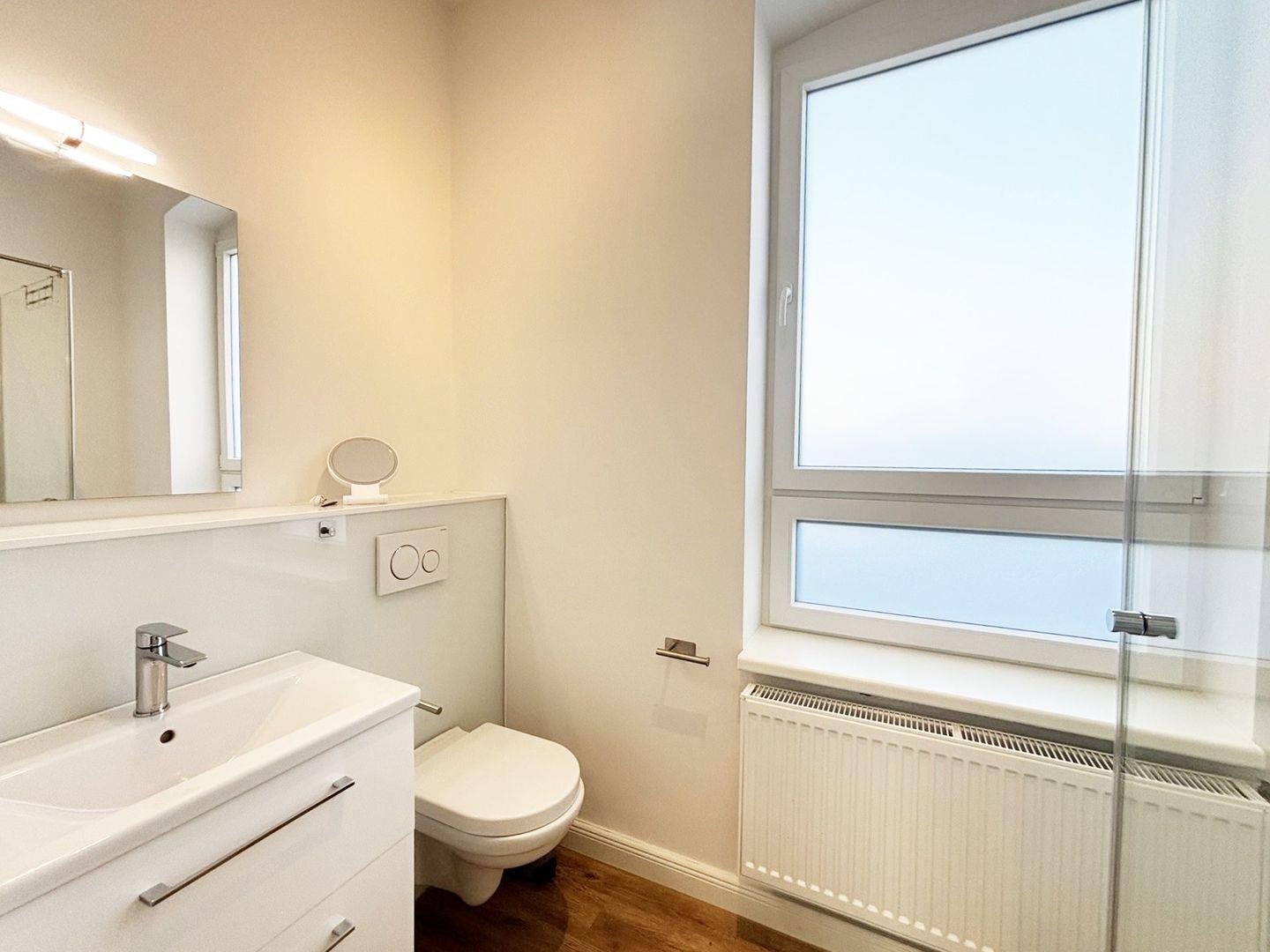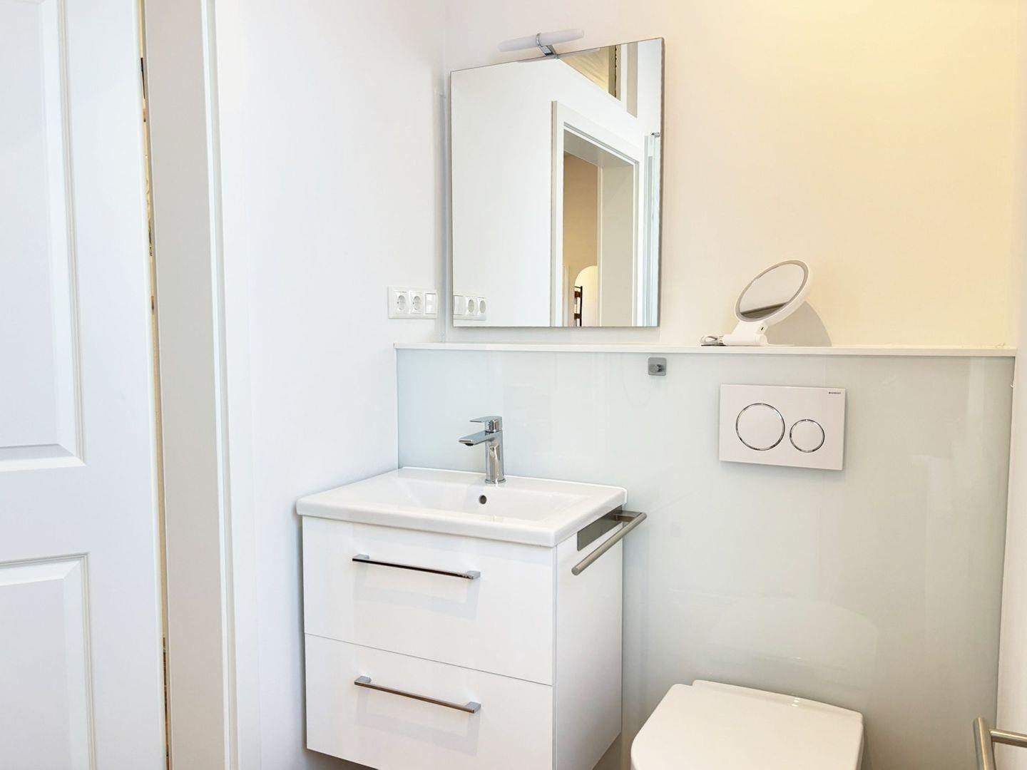 Das Badezimmer verfügt über eine Dusche mit einem niedrigen Einstieg von 10 cm, ein WC, ein Waschbecken mit Spiegel, ein Fenster für Tageslicht sowie einen Haartrockner. Für zusätzlichen Komfort stehen ein Bügeleisen, ein Bügelbrett, ein Staubsauger und ein Ganzkörperspiegel zur Verfügung.